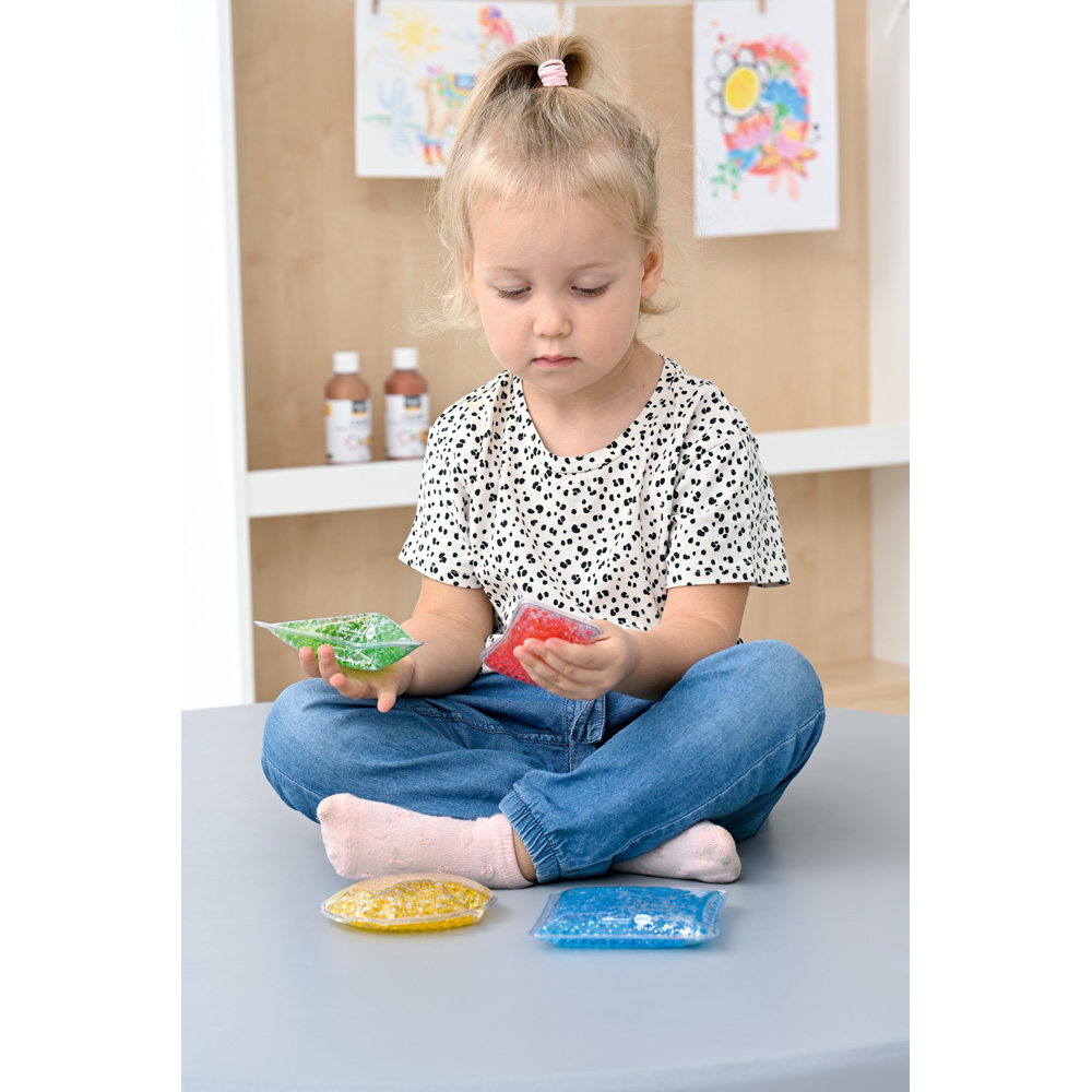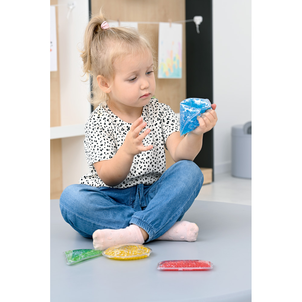 Dieses sensorische Spielzeug komplettiert die Kindergarten-Ausstattung. Die 4 Formen sind mit Gelkugeln gefüllt, sie können nach Herzenslust geknautscht, geknetet und gepresst werden. Hilft den Kindern, geometrische Formen und Farben kennenzulernen.