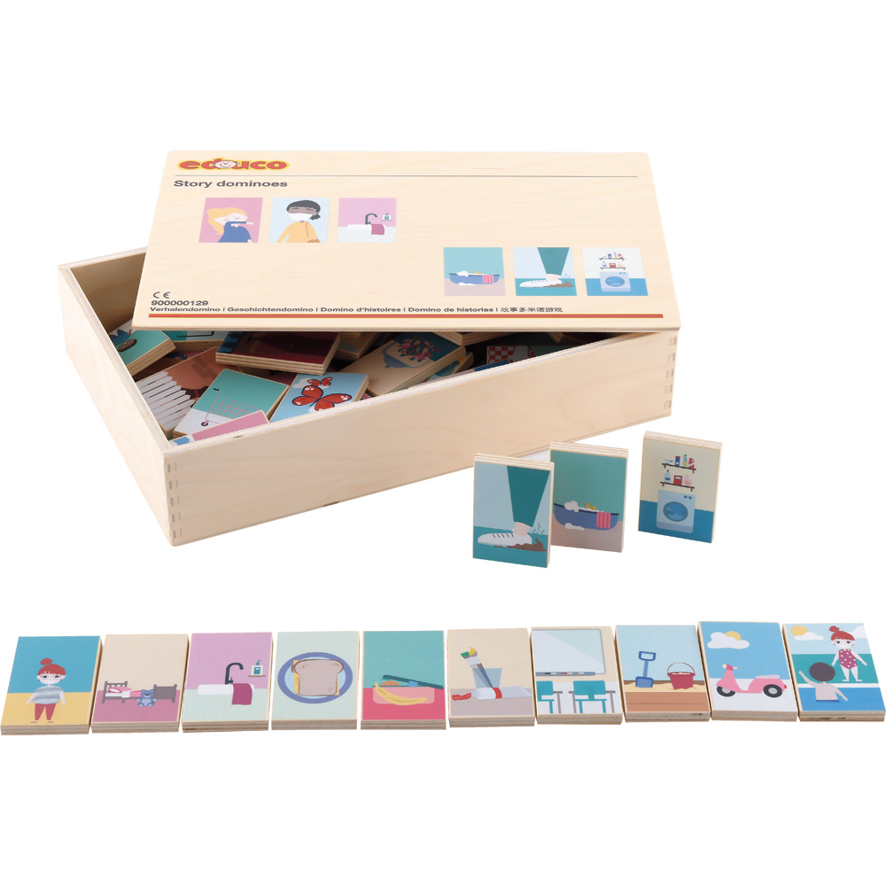 Wie lang wird deine Geschichte sein? Lege die Dominosteine in eine Reihenfolge, die du dir selbst ausgedacht hast, und sprich anschliessend darüber. Fördert den Wortschatz und das Erzählen von Geschichten. Die Kinder üben grundlegende Wörter und bringen sie in den richtigen Kontext. Sie lernen, eine Geschichte zu konstruieren und sich zu artikulieren. Die Dominosteine stellen verschiedene Themen dar und können danach sortiert werden (Menschen, Körperpflege, Essen und Trinken, Tiere und Aktivitäten). Das Geschichten-Domino kann auch zur Förderung von Feinmotorik (präzises Aufstellen der Holzsteine) und Mathematik (Sortierübungen) eingesetzt werden.