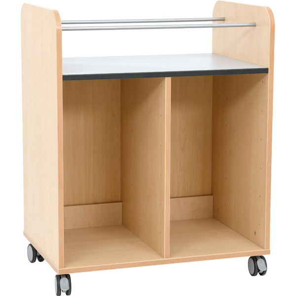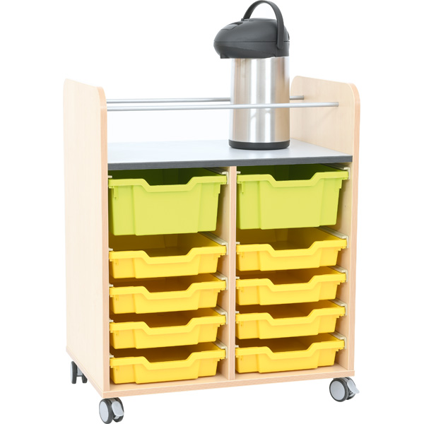 Ein praktischer Wagen für den bequemen und sicheren Transport von Getränken in Kannen und anderen Behältnissen. Unten 2 geräumige Fächer für Kunststoffbehälter (372xxx, separat bestellbar, pro Fach bis zu 6 flache Behälter), z.B. zur Aufbewahrung von sauberen oder benutzten Bechern.
