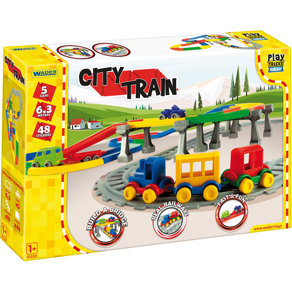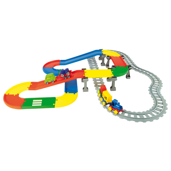 Streckennetz, bestehend aus Schienen und Fahrbahn – so muss sich kein Kind entscheiden, ob es mit dem Auto oder dem Zug spielen möchte. Enthalten sind verschiedene Kurven, Kreuzungen und Unterführungen, sodass sich viele Gestaltungsmöglichkeiten ergeben. 4 Fahrzeuge und verschiedene Sticker sorgen für sofortigen Spielspass.