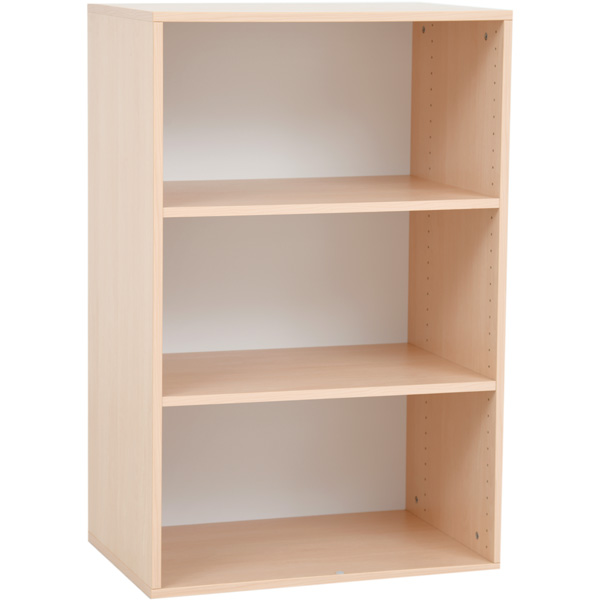 Regale Grande aus laminierter Spanplatte (18 mm), in Ahorn-Optik oder weiss. In 2 Breiten und 2 Höhen. Tiefe stets 48 cm. Kunststoffbehälter inklusive.