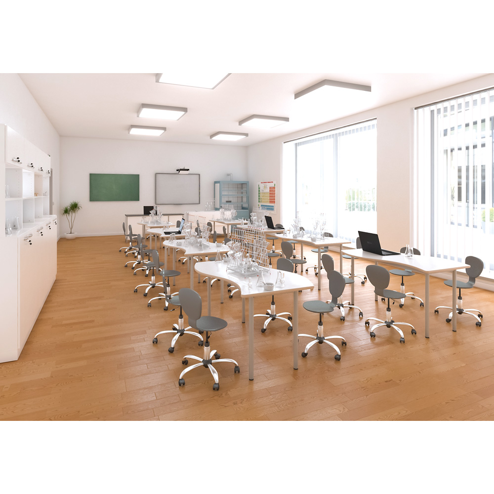 Fahrbarer Drehstuhl mit ergonomisch geformter Sitzschale aus Kunststoff. Das Gestell ist mit Rollen ausgestattet und höhenverstellbar. Die leicht federnde Rückenlehne passt sich auf natürliche Weise dem Körper an und unterstützt die richtige Sitzhaltung. Die breite Sitzfläche unterstützt den Körper, so sitzt man bequem auch an langen Schultagen. Der Stuhl ist sehr robust, schmutz- und wasserabweisend.