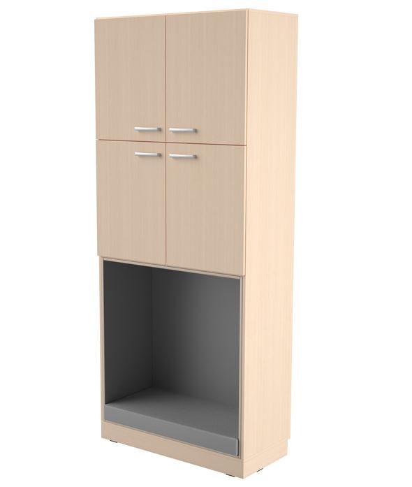 Ein geräumiger Aufbewahrungsschrank, wahlweise mit einer Sitznische erhältlich. Geeignet für Hort und ähnliche Aufenthaltsräume in Bildungseinrichtungen. Die Nische ist mit grauem, HPL-laminiertem Sperrholz verkleidet (leicht überstehend) und mit einer Matte mit pflegeleichtem Kunststoffbezug gepolstert. Hinter jeder mittelgrossen Tür gibt es 1 verstellbaren Fachboden.