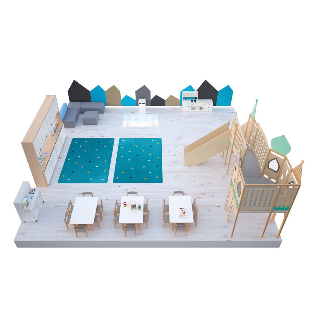 Die Tischplatten sind aus farbigem HPL-beschichtetem Sperrholz (Stärke: 25 mm); Kanten und Ecken sind abgerundet. 5 Formen (Quadrat, Rechteck, Trapez, Kreis und Halbkreis) in 5 Farben (Buche, gelb, blau, grün, weiss) stehen zur Verfügung.
