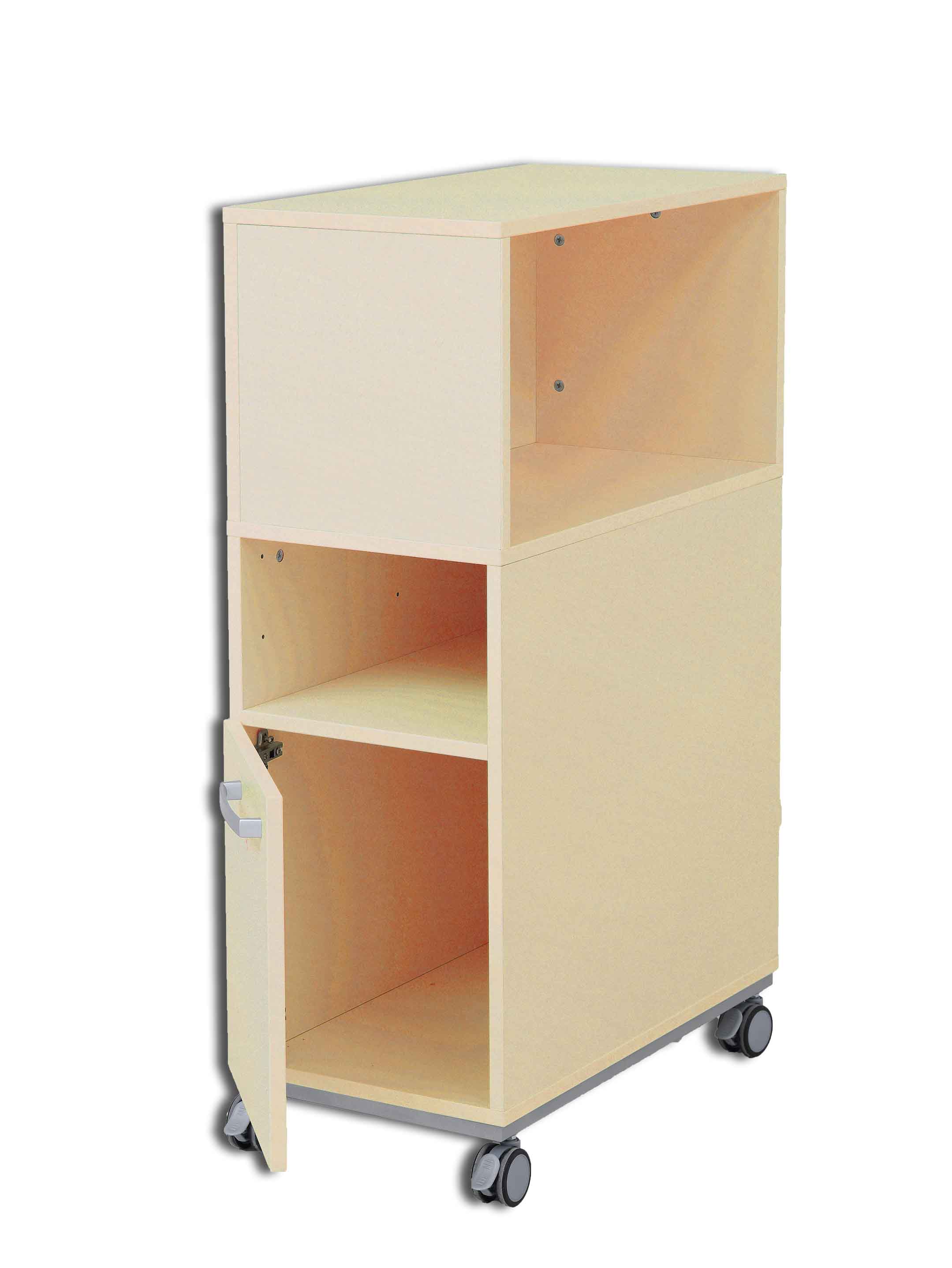 Grande Schreibtischrollschränke passen zu allen Schultischen mit Standardtiefe 50 cm bzw. Seitenlänge 70 cm. So schaffen Sie viele Möglichkeiten, den Arbeitsplatz zu gestalten. Die Tür ist rechts- oder linksseitig montierbar (Griffvorbohrungen für beide Montagevarianten auf der Türinnenseite). Der Schrank kann als Taschenfach genutzt werden. Ins offene Fach passen 2 flache oder 1 mittlerer Kunststoffbehälter (Art-Nr. 372xxx, in 13 Farben, separat bestellbar).
