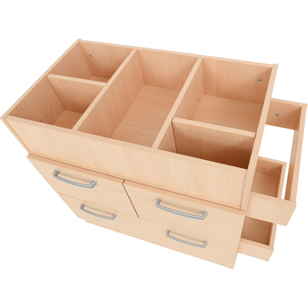 Ideal für den Kunst-, Musik- oder Experimentierbereich. Verfügt über 1 breite und 2 schmale Schubladen sowie offene Fächer für höhere Gegenstände. An der Seite befindet sich unten 1 Fach (Innenmasse: 11 x 40 x 10 cm) und oben ein Rahmen – zur sicheren Aufbewahrung von Papierrollen u.ä.