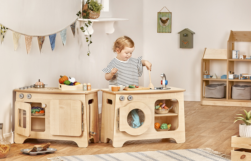Das Grantham Spielküchen-Set fördert fantasievolles Rollenspiel und spielerisches Lernen im Alltag. Es ist als Komplettset oder als einzelne 2-in-1 Module erhältlich: Spüle mit Waschmaschine sowie Ofen mit Kühlschrank – jeweils geeignet für Kinder ab 18 Monaten.