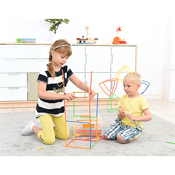Halme lassen sich mit den Verbindungsstücken leicht in alle Richtungen zusammenstecken. So entstehen unzählige Konstruktionen - von flachen Figuren bis zu großen, komplizierten Bauwerken.