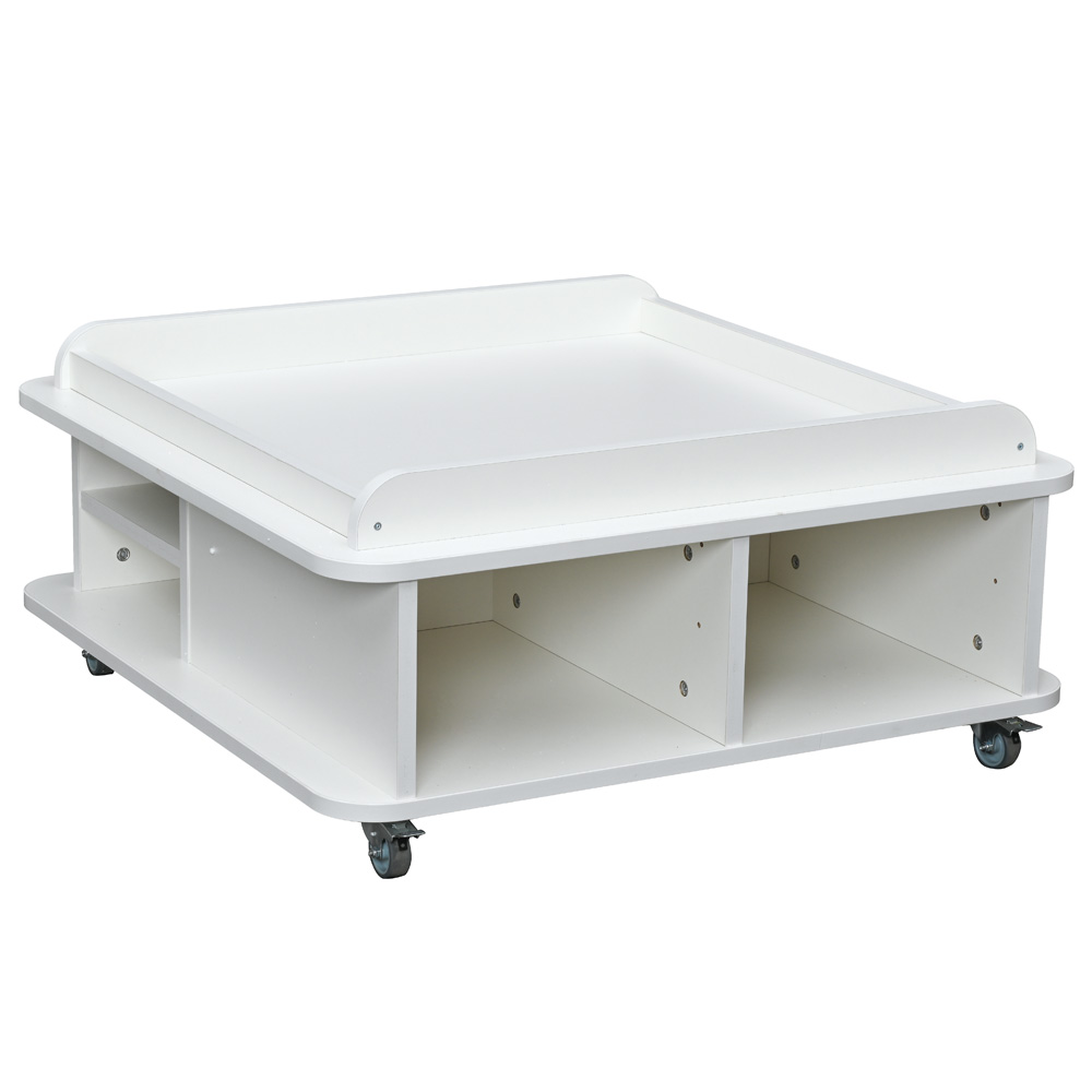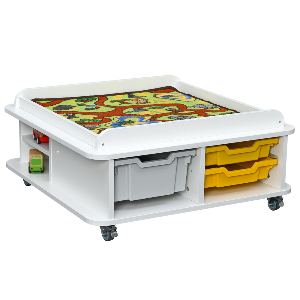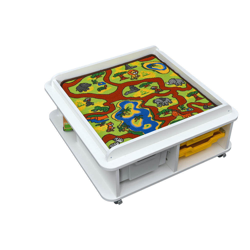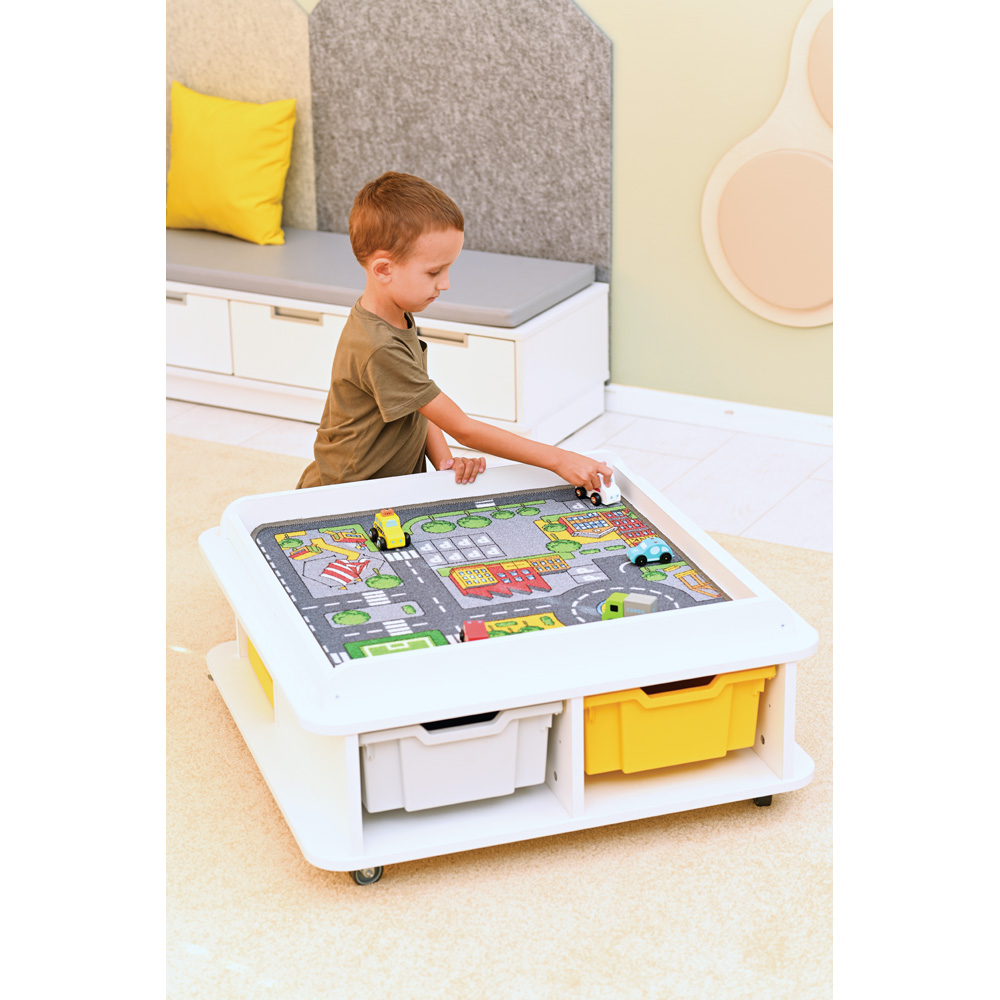 Dieser Tisch bietet sowohl Platz zum Spielen als auch Stauraum. Die Spielmatten eignen sich für die Deckplatte; diese bildet zudem die ideale Unterlage zum Spiel mit der Holzeisenbahn (z.B. 575001–575055) oder mit Holzbausteinen (u.a. 542015–542019). Im Unterbau befinden sich an zwei gegenüberliegenden Seiten Regalteile. Grosse offene Fächer können individuell mit unseren Kunststoffbehältern (Art. Nr. 372xxx – in 13 Farben – separat zu bestellen) ausgestattet werden; passende Führungsschienen werden mit den Behältern geliefert.