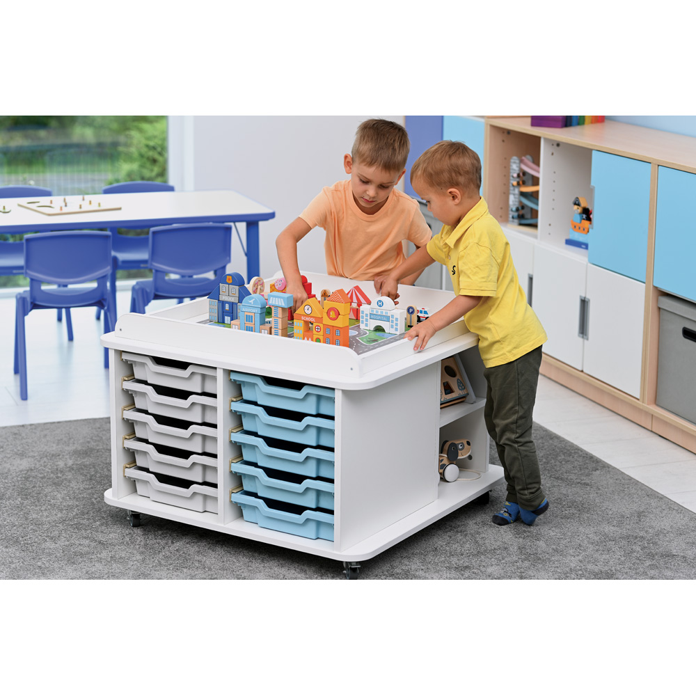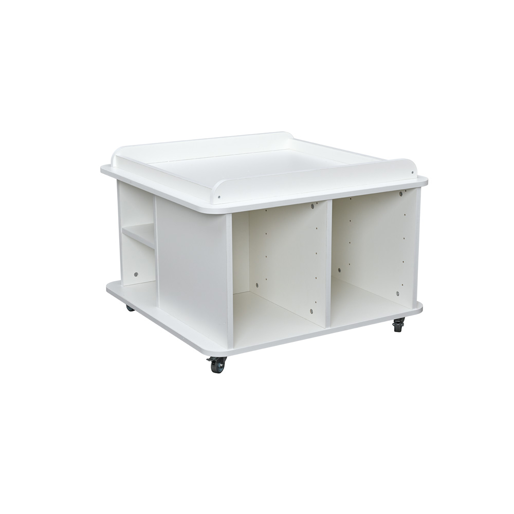 Dieser Tisch bietet sowohl Platz zum Spielen als auch Stauraum. Die Spielmatten eignen sich für die Deckplatte; diese bildet zudem die ideale Unterlage zum Spiel mit der Holzeisenbahn (z.B. 575001–575055) oder mit Holzbausteinen (u.a. 542015–542019). Im Unterbau befinden sich an zwei gegenüberliegenden Seiten Regalteile. Grosse offene Fächer können individuell mit unseren Kunststoffbehältern (Art. Nr. 372xxx – in 13 Farben – separat zu bestellen) ausgestattet werden; passende Führungsschienen werden mit den Behältern geliefert.