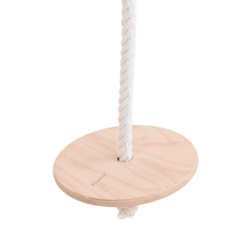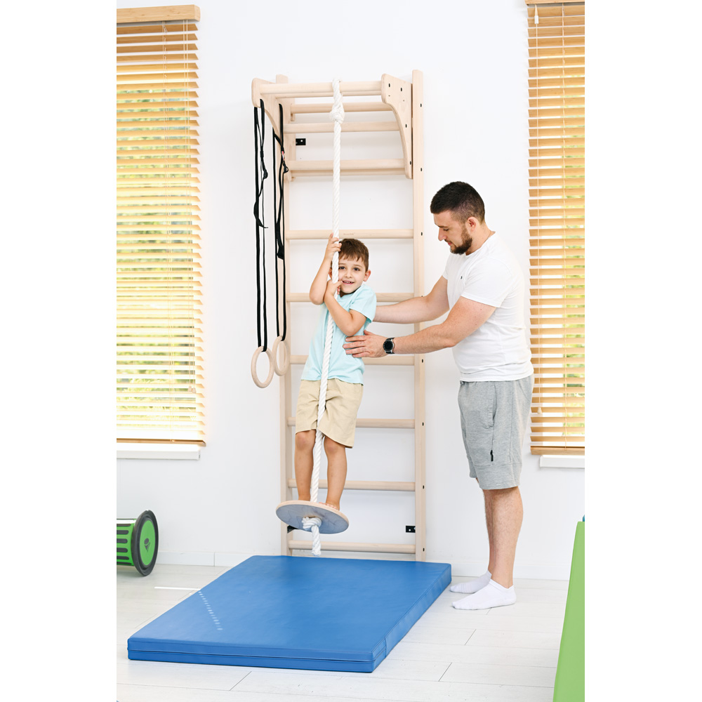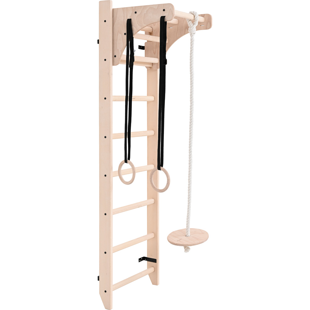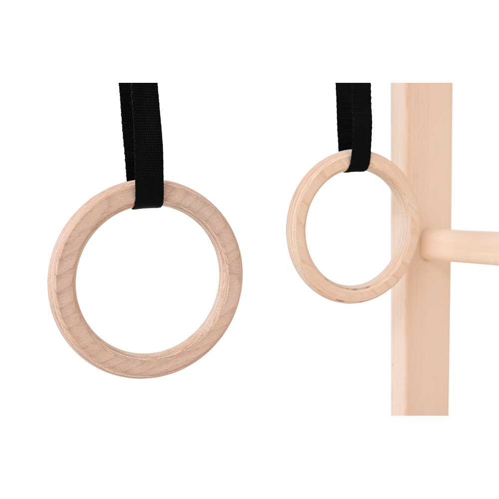 Aus Buchenholz mit höhenverstellbarem Klimmzugbügel und weiterem Zubehör, das an diesem befestigt wird: Gymnastikringe und Tellerschaukel. Produktabweichungen möglich.