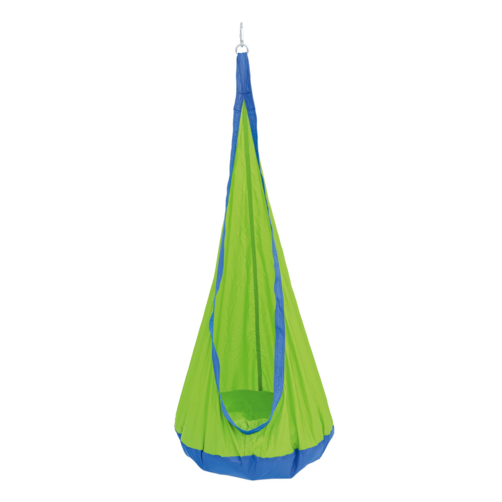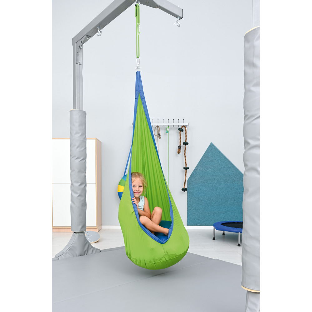 Der Hängesitz schirmt vor äusseren Reizen ab und hilft, sich auf eine Sache zu konzentrieren, sei es bei einer visuellen oder auditiven Übung. Der Hängesitz kann geschlossen werden (Klettverschluss), so dass sich das Kind in einer Art Kokon befindet und die Ruhe geniesst.