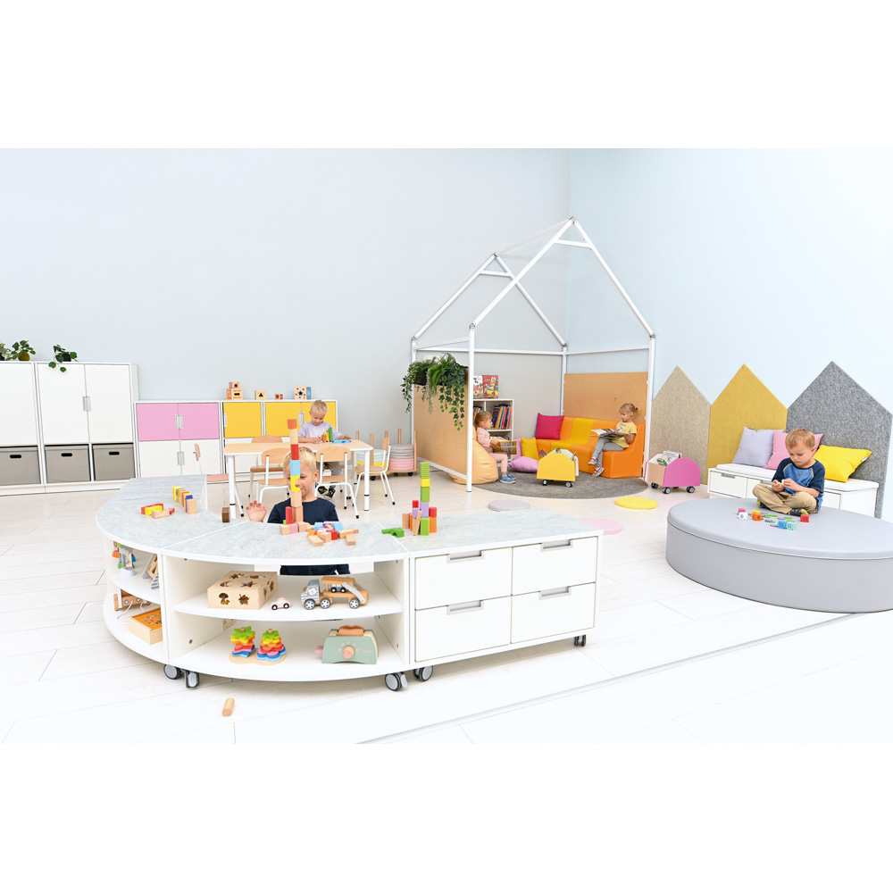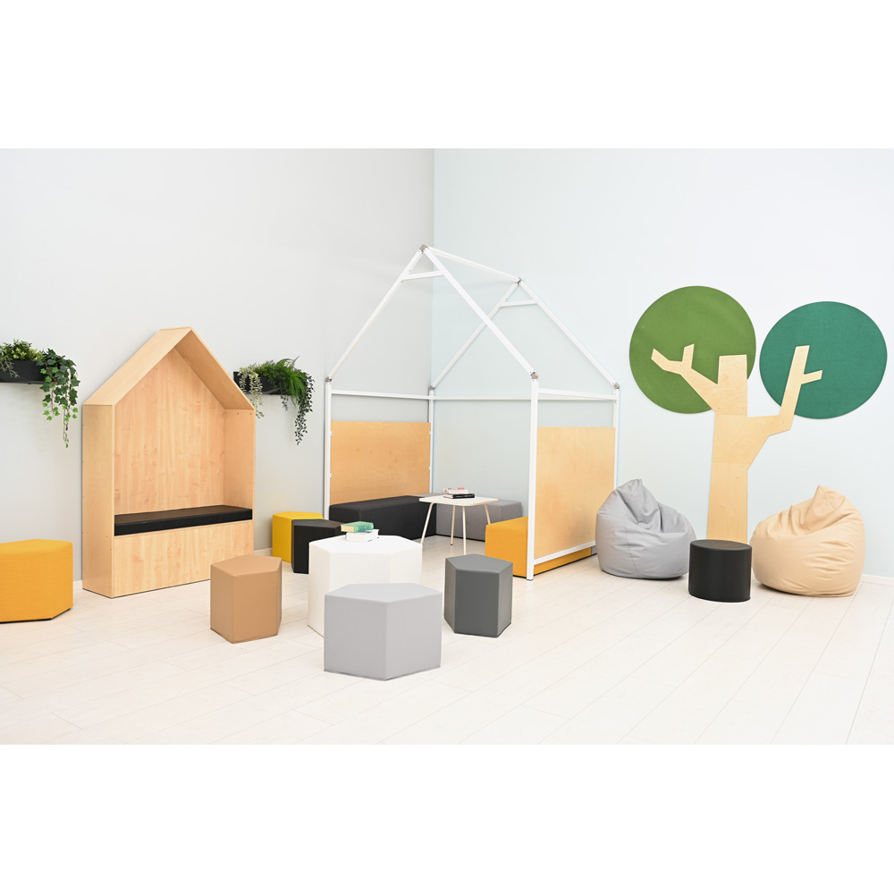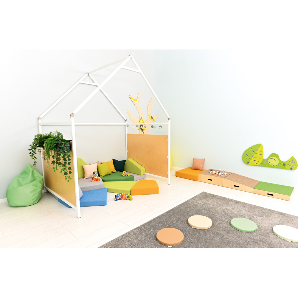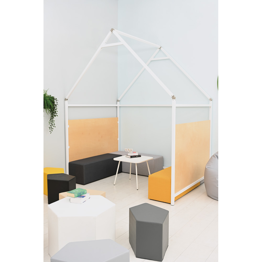 Hier finden Kinder einen gemütlichen Platz zum Entspannen. Das Häuschen kann als Lese- oder Ruheecke genutzt werden sowie als Raumteiler z. B. in einem Schulflur. Das Metallgestell des Daches und die Seitenstreben können nach Wunsch gestaltet werden, z. B. mit einer Lichterkette oder Blumenampeln. Das Häuschen ist offen, die 2 Seitenwände sind aus Sperrholz. Die Rückseite besteht aus 2 Querstreben.