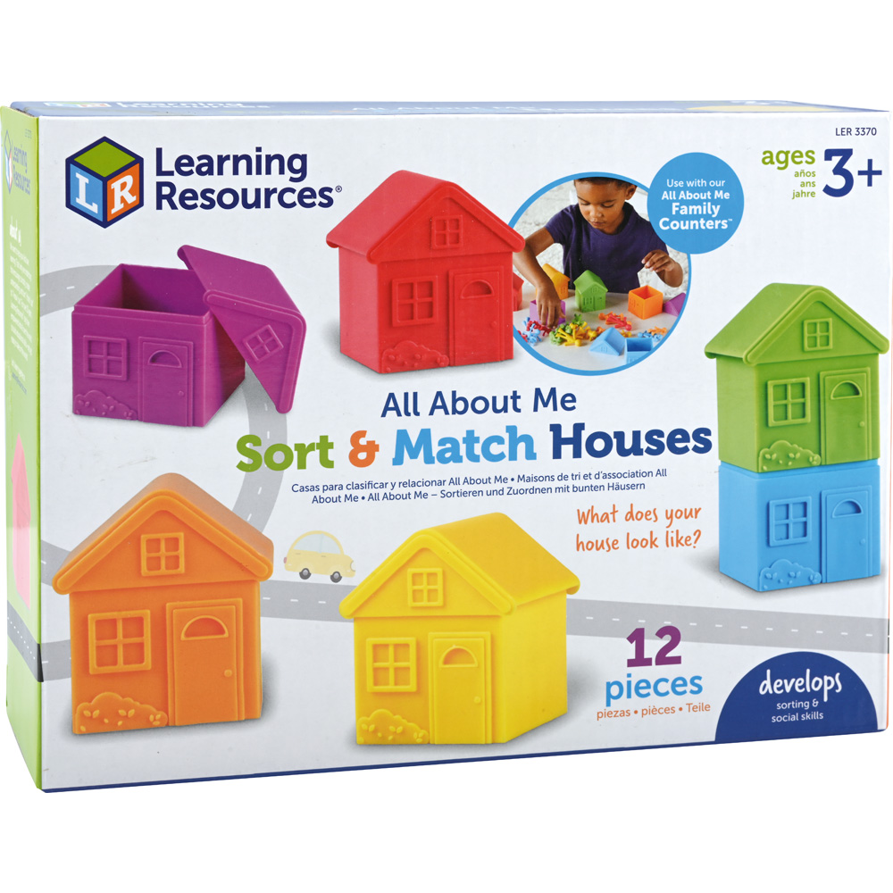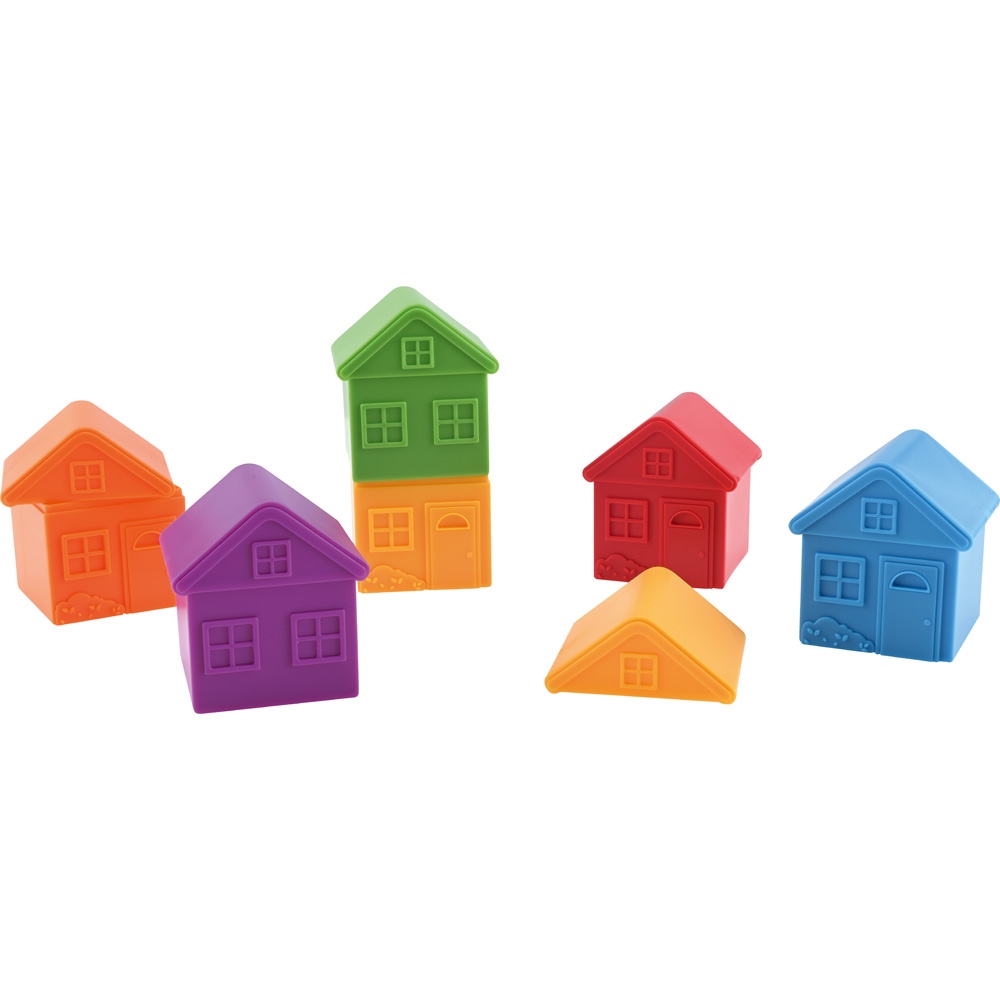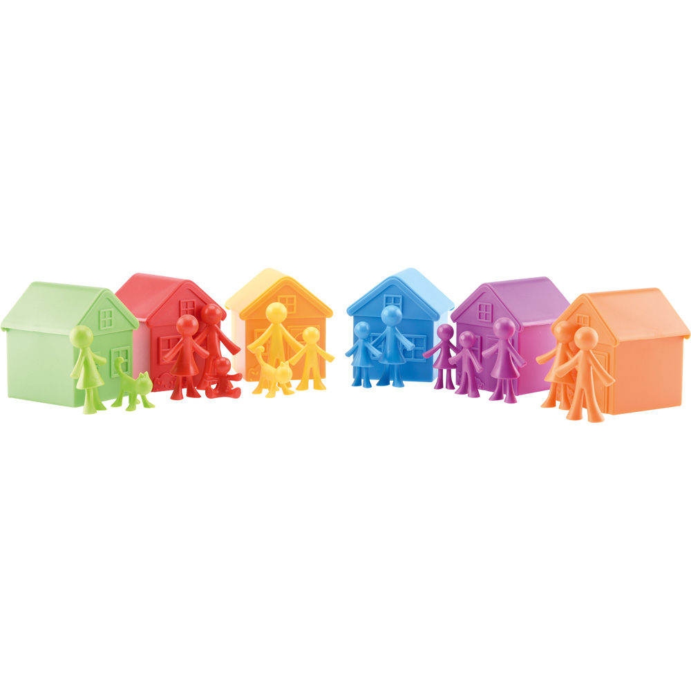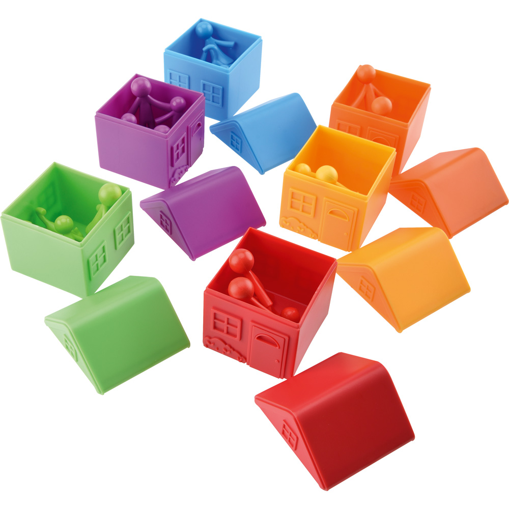 Die bunten Häuschen mit abnehmbaren Dächern lassen sich beliebig sortieren und stapeln. Beim Spielen lernen die Kinder Farben zu unterscheiden und entwickeln auch die Fähigkeit, sie anhand eines bestimmten Merkmals zuzuordnen. Passende Bewohner (358055) separat bestellbar.
