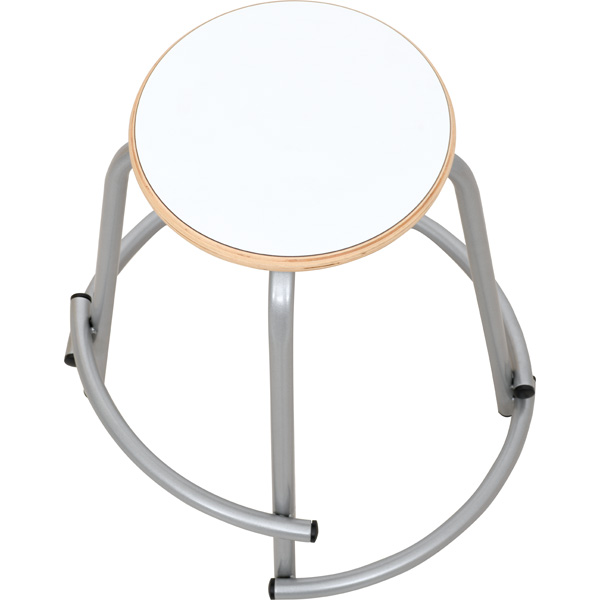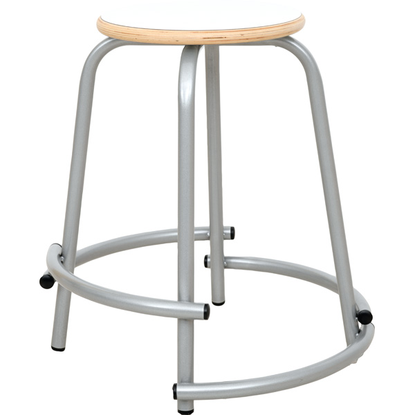 Hocker mit weisser Sitzfläche aus HPL-beschichtetem Sperrholz (Stärke 19 mm); Beine aus Metallrohr (22 mm); Kratzschutz verhindert Schäden am Fussboden. Mit einer Fussstütze auf jeder Seite, in unterschiedlichen Höhen angebracht. So kann der Hocker von Kindern unterschiedlichen Alters und Grösse genutzt werden.