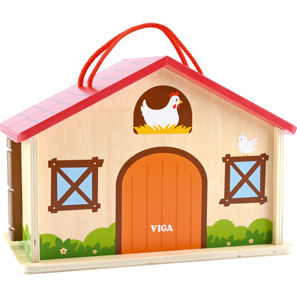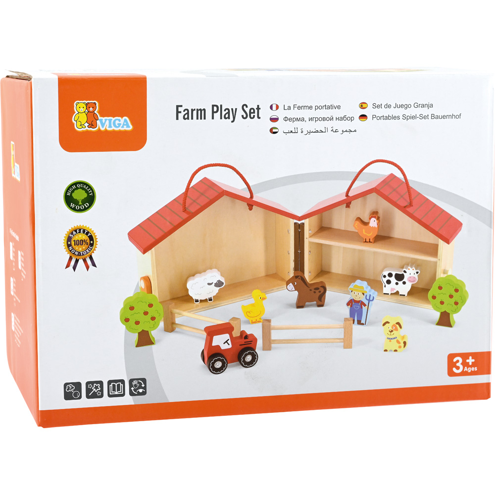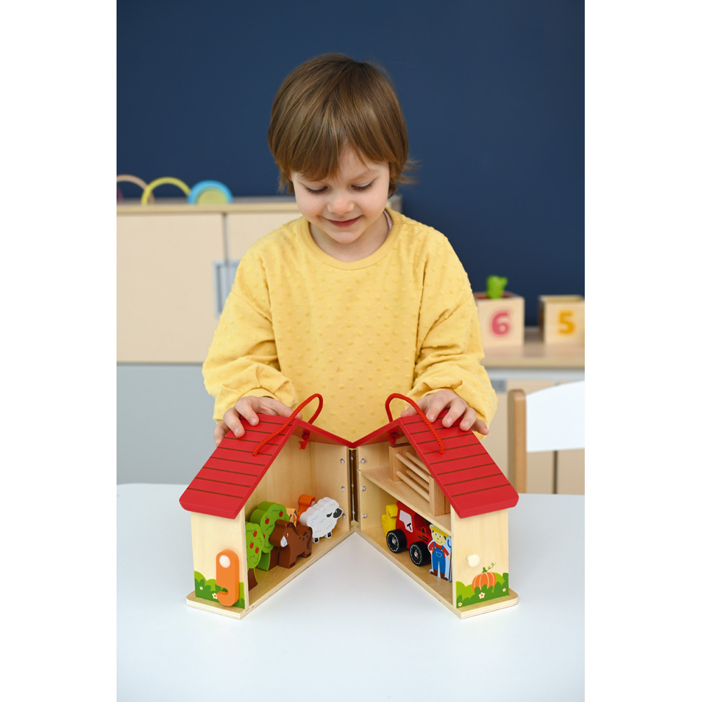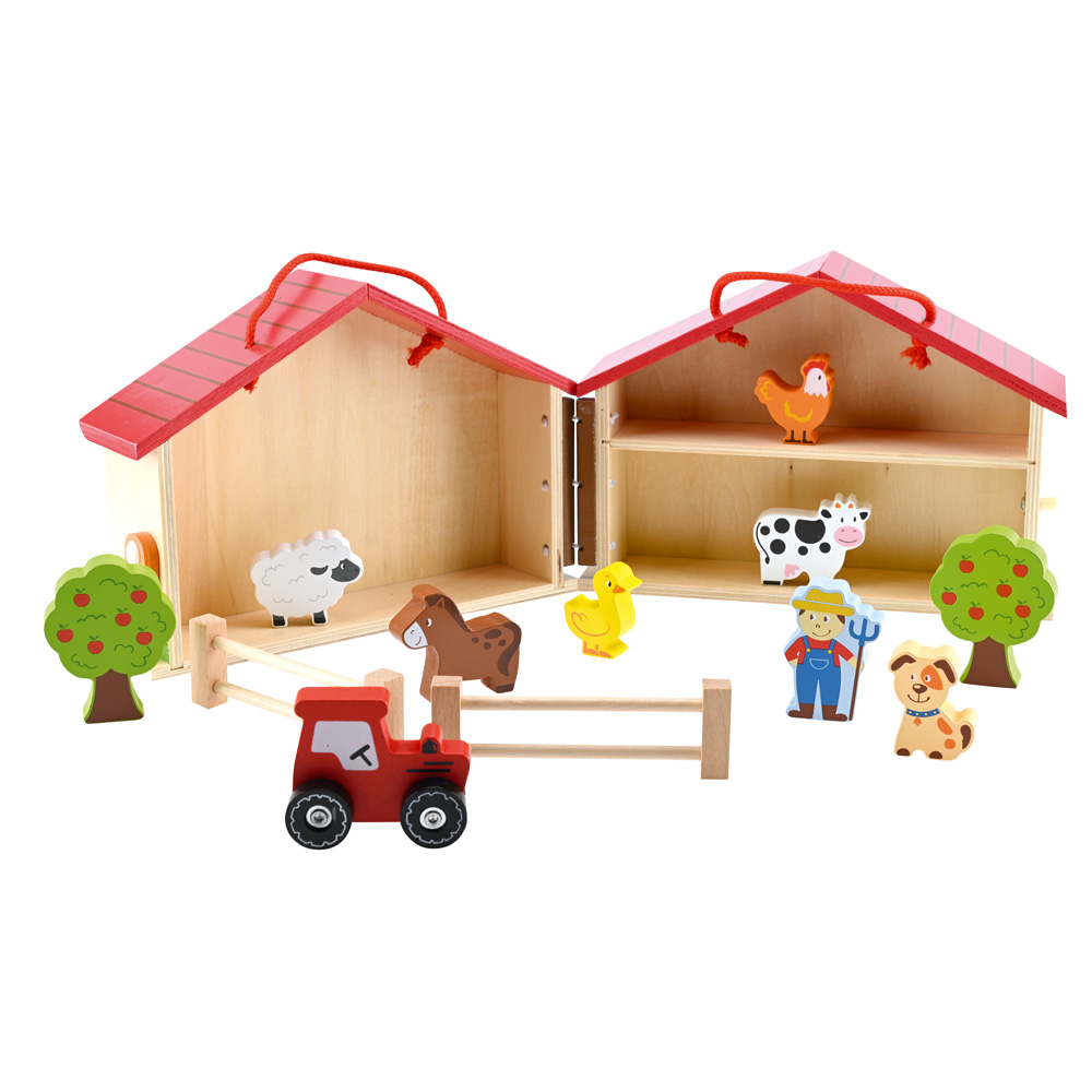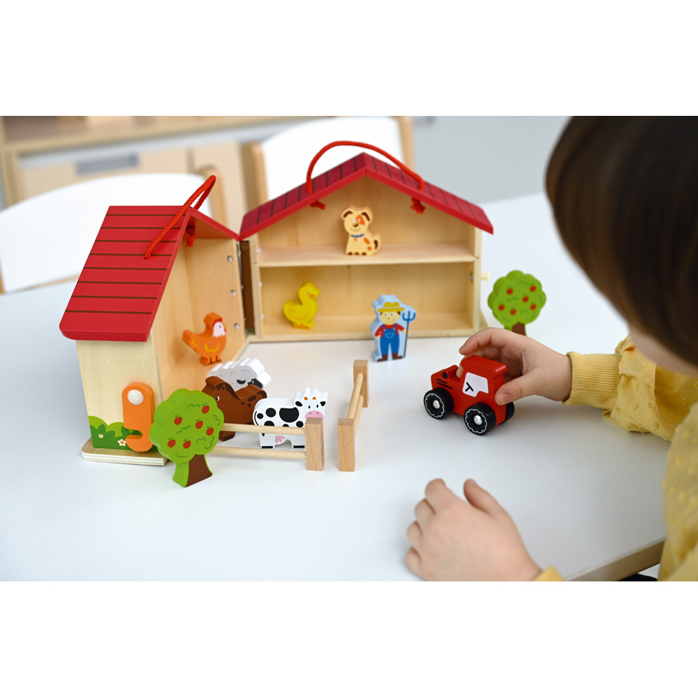 • 1 Farmhaus mit Tragegriff, 1 Bauer, 1 Hund, 1 Pferd, 1 Kuh, 1 Schaf, 1 Hahn, 1 Ente, 2 Obstbäumchen, 1 Traktor, 2 Zaunelemente