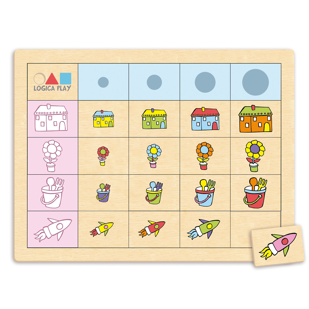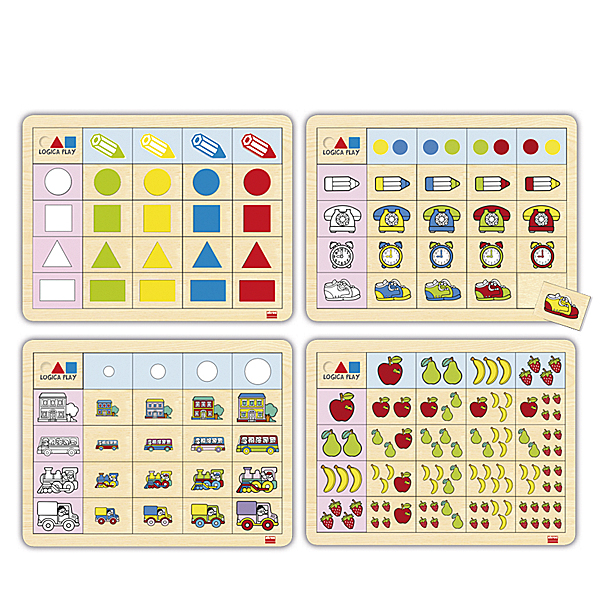 Vier thematisch sortierte Spielbretter, auf denen Bildkarten nach unterschiedlichen Kriterien wie Grösse, Farbe, Position oder Anzahl angeordnet werden sollen. Hier sind logisches Denken und gute Beobachtungsgabe gefragt. Die Kinder können einzeln, gemeinsam oder im Wettstreit miteinander spielen.