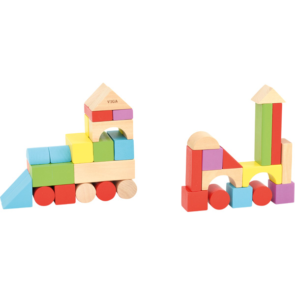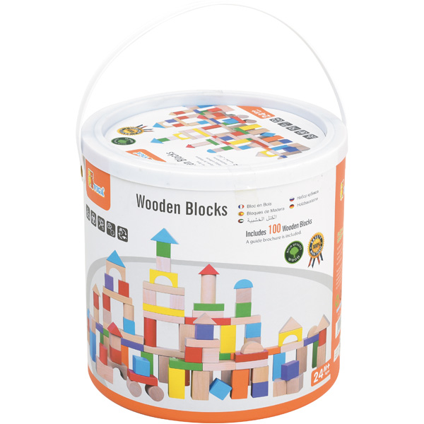 Bausteine sind das ideale Spiezeug, um Fantasie und Kreativität der Kinder anzuregen. Holzbausteine im Pappeimer mit Plastikdeckel.