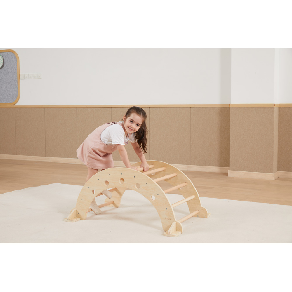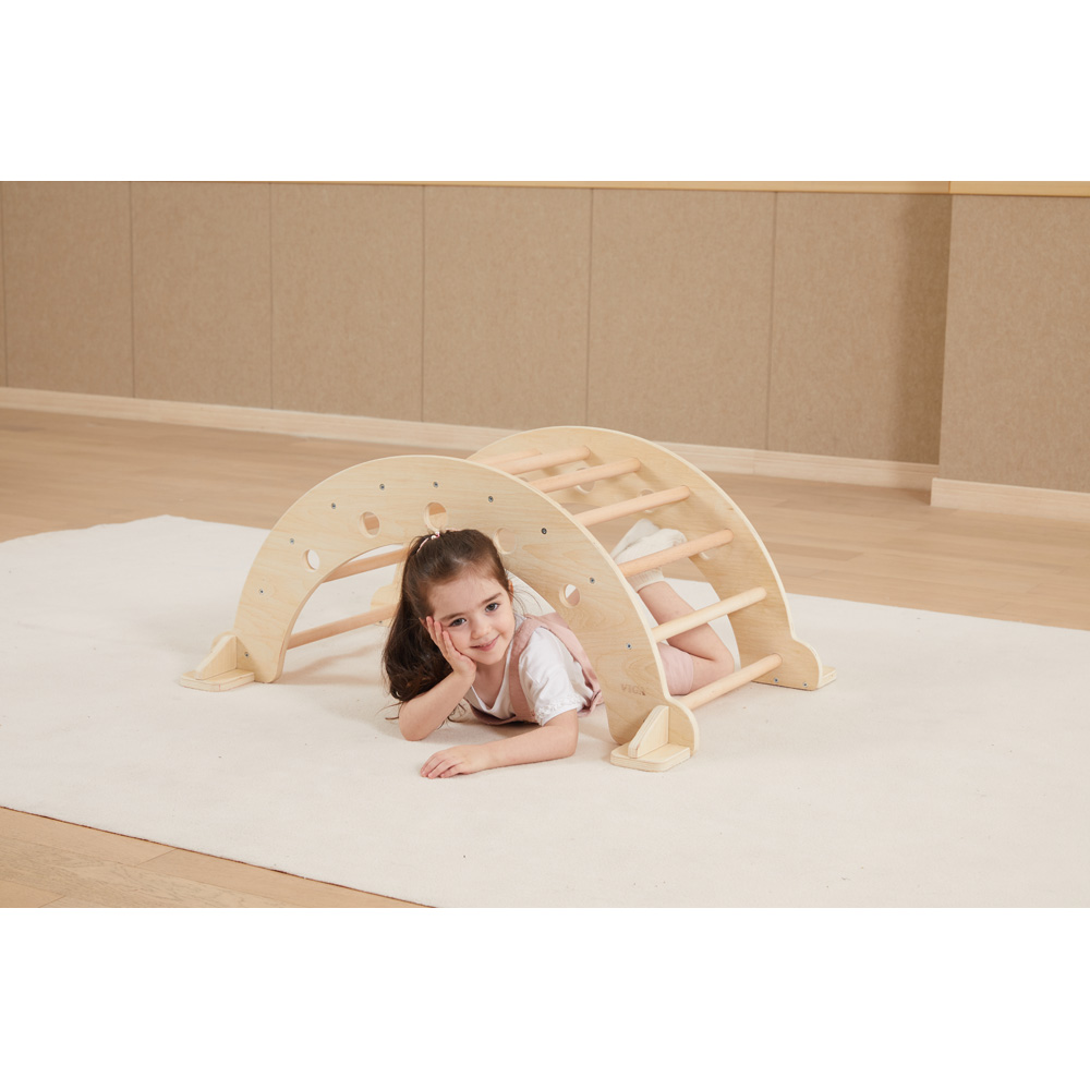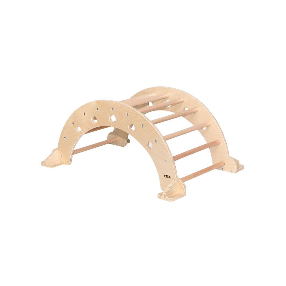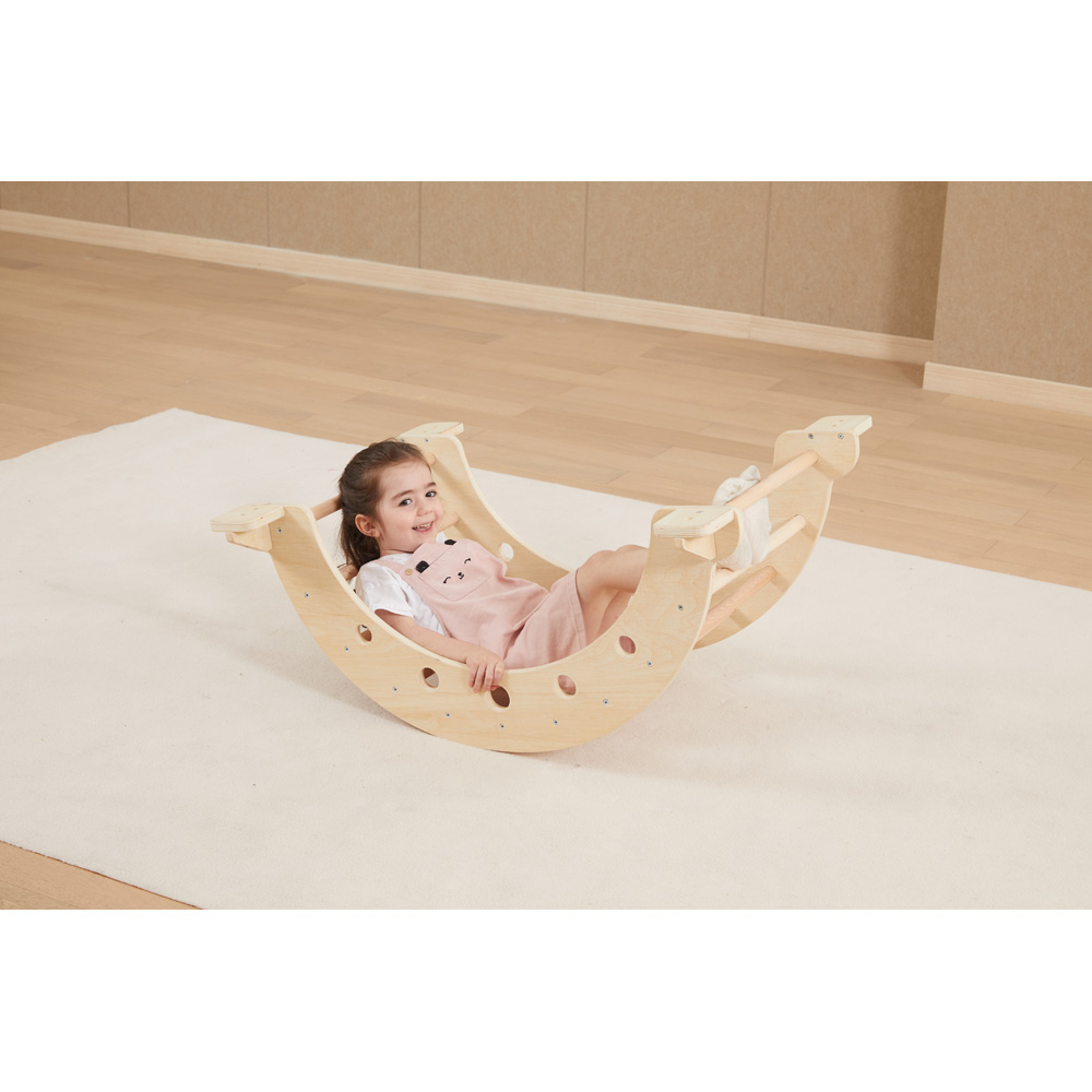 Die eigene Balance zu finden, gehört für Kleinkinder zu einer der wichtigsten Entwicklungsstufen. Die Schaukelwippe fördert diese Entwicklung und sorgt für die ideale Unterstützung von Koordination und eigener Körperwahrnehmung – frei nach den Erziehungsmethoden von Montessori. Einmal umgedreht wird aus der Holzwippe sofort ein kleiner Tunnel bzw. eine Brücke, die erkundet werden sollen.