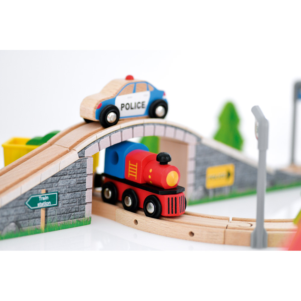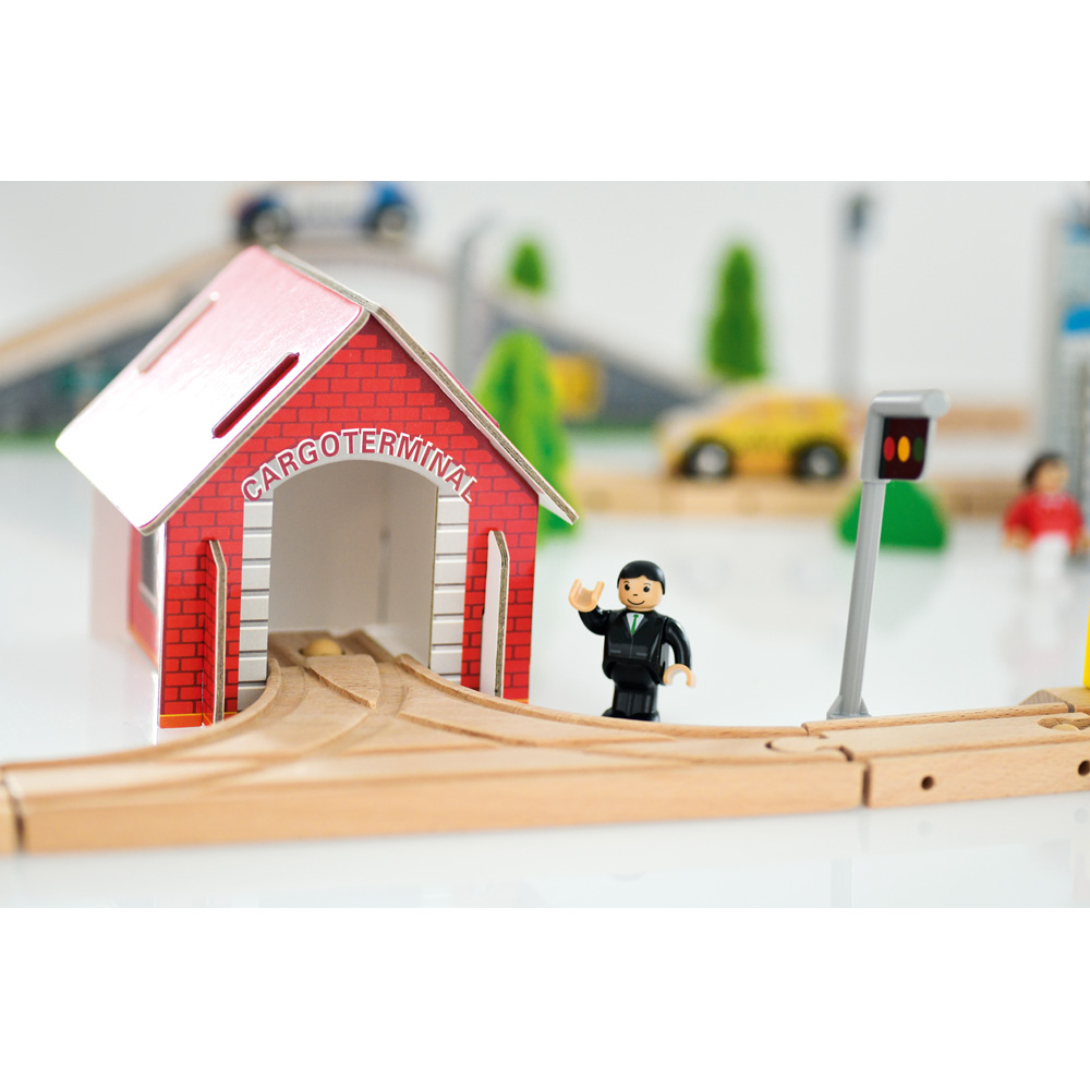 Vielseitig nutzbare Schienenbahn aus Holz, mit zahlreichen Details und Zubehör. Bietet viele verschiedene Aufbaumöglichkeiten, dies fördert die Kreativität der Kinder und bereitet immer wieder neuen Spielspass - egal ob allein oder mit Freunden. Sollte doch einmal etwas fehlen, liefern unsere Erweiterungssets die Grundlage für neue Spielideen (575001 bis 575055, separat bestellbar). Stabiles Kinderspielzeug aus Holz, erweiterbar.