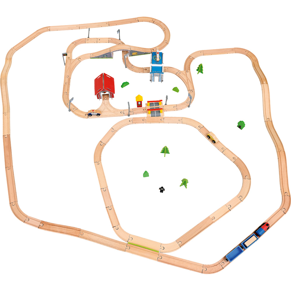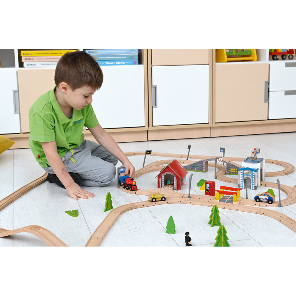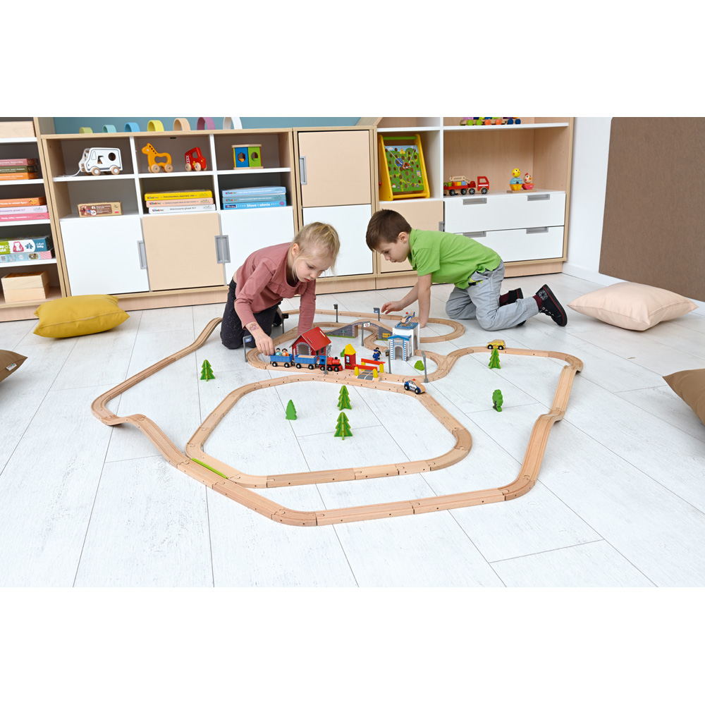 Vielseitig nutzbare Schienenbahn aus Holz, mit zahlreichen Details und Zubehör. Bietet viele verschiedene Aufbaumöglichkeiten, dies fördert die Kreativität der Kinder und bereitet immer wieder neuen Spielspass - egal ob allein oder mit Freunden. Sollte doch einmal etwas fehlen, können Fahrzeuge oder Schienen einzeln nachbestellt werden (Art. Nr. 575xxx, separat bestellbar). Stabiles Kinderspielzeug aus Holz, erweiterbar.
