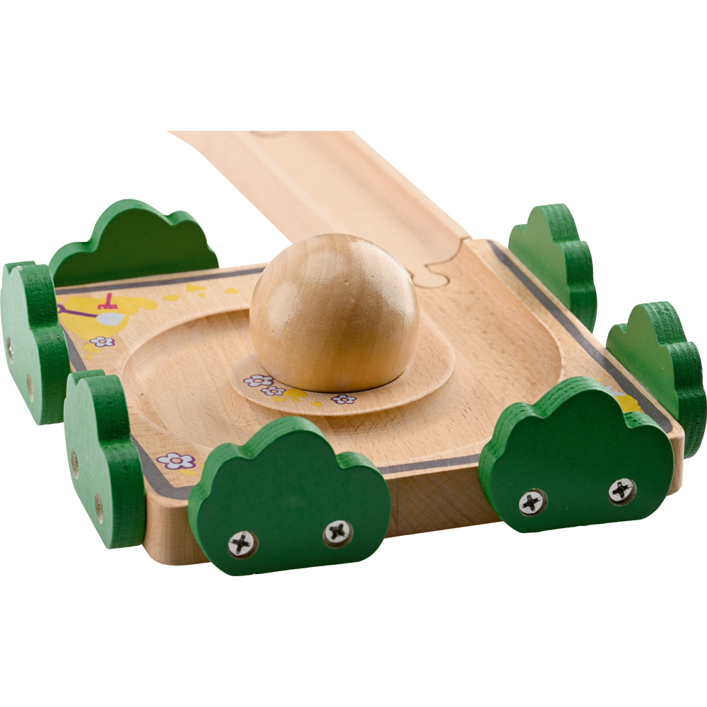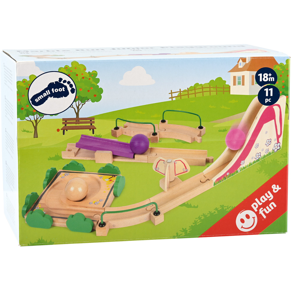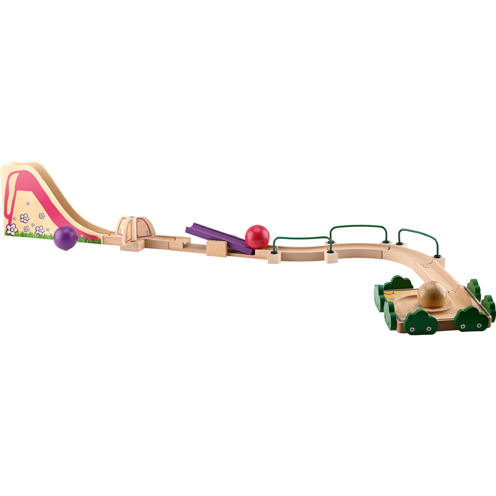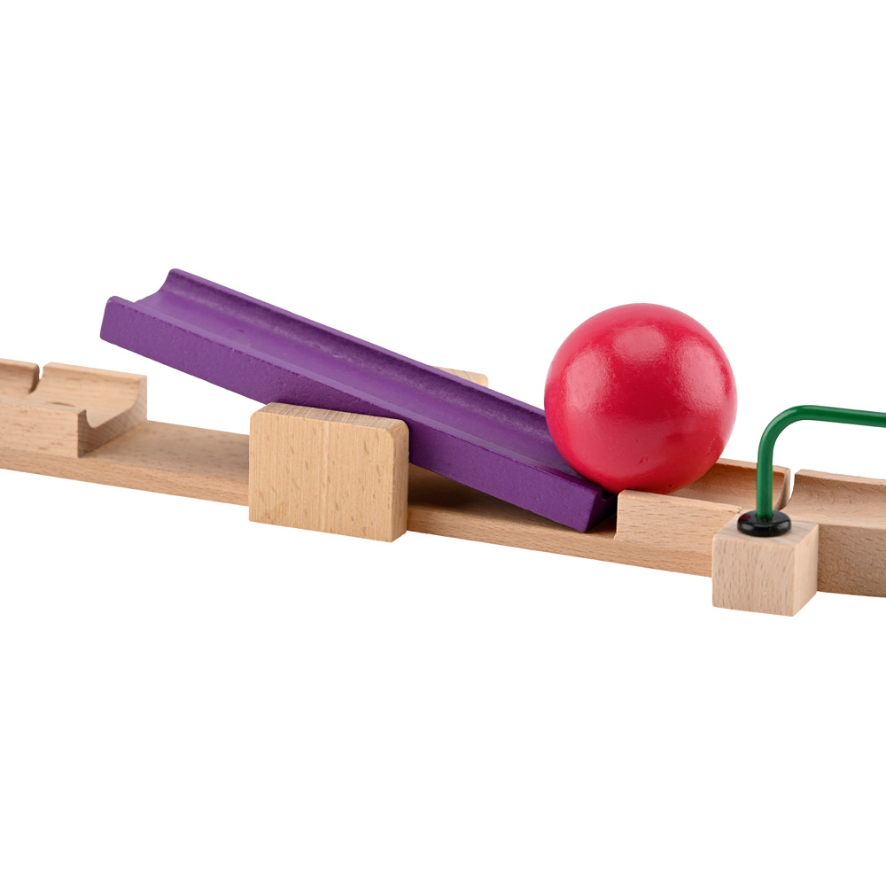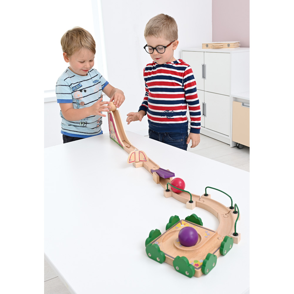 Beim Spielen mit der Kugelbahn lernen die Kinder Zusammenhänge von Ursache und Wirkung kennen, entwickeln visuelle Wahrnehmung und Kreativität. Die Elemente der Bahn können in verschiedenen Konfigurationen kombiniert werden. Elemente wie eine Rutsche, ein Karussell, eine Schaukel und eine Schnecke machen das Spiel noch interessanter. Die Grösse der Kugeln ist für Kinder unter 3 Jahren geeignet.