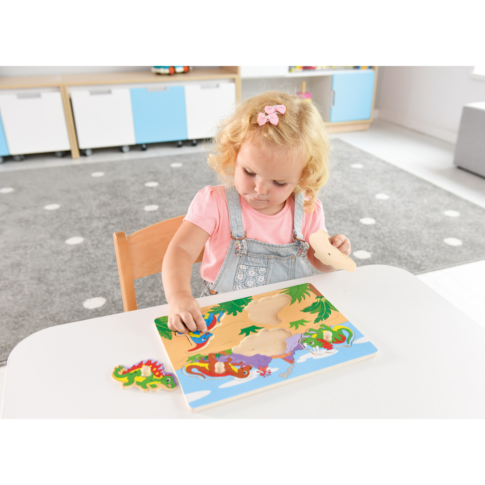 Ein kreatives Spielzeug, das die Feinmotorik und das logische Denken fördert. Die Aufgabe des Kindes besteht darin, die Puzzleteile mit den Figuren an den entsprechenden Stellen zu platzieren. An jedem der Elemente befindet sich ein Holzgriff, der das Greifen erleichtert.