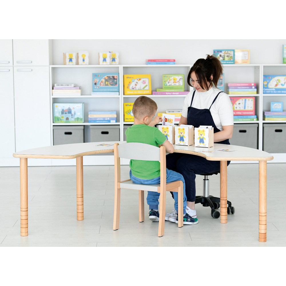 Solider Echtholztisch aus HPL-laminiertem Sperrholz (Stärke: 25 mm), Kanten und Ecken abgerundet, mit runden Holzbeinen (Buche, massiv, Ø 48 mm) mit Höhenverstellung.