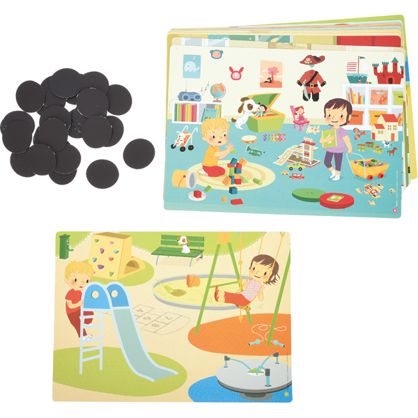 • 10 Spielbretter aus Karton, Masse: 35 x 25 cm, mit Alltagsszenen: Küche/Essen, Anziehen/Bekleidung, Bad/Hygiene, Fahrzeuge/Verkehr, Bauernhof, Schwimmbad, Kindergarten/Spielzimmer, Spielplatz, Park, Schlafen/Träume