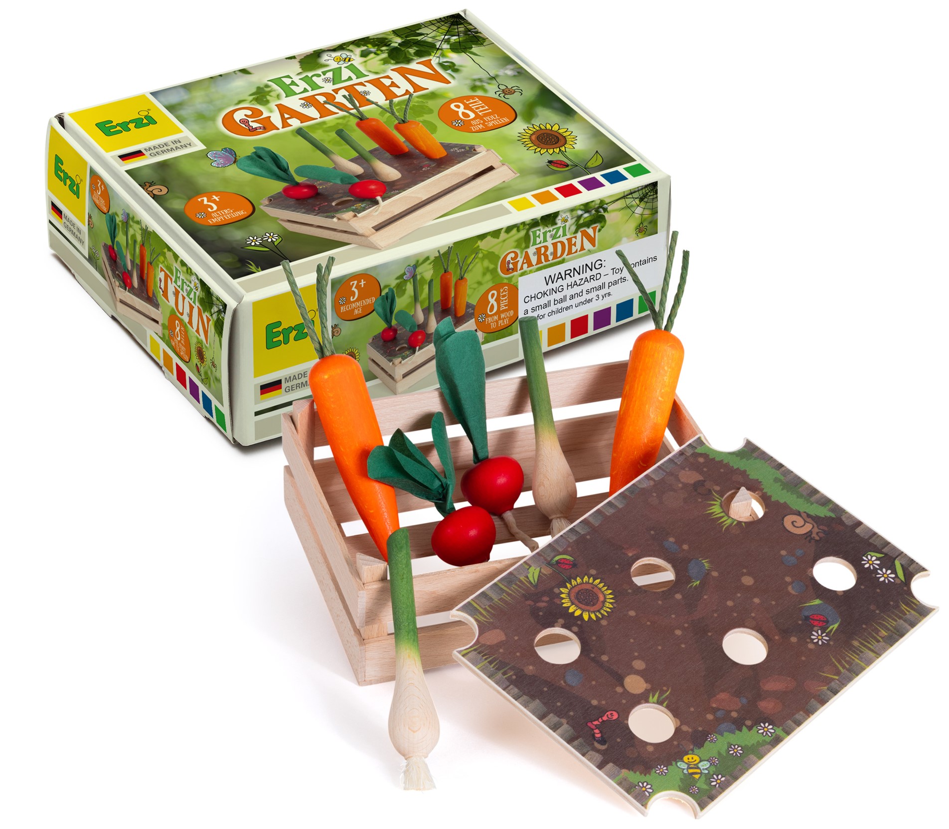• das Set beinhaltet: 2 Möhren, 2 Radieschen, 2 Frühlings-zwiebeln, 1 Stiege, 1 bedruckter Deckel mit Lochung