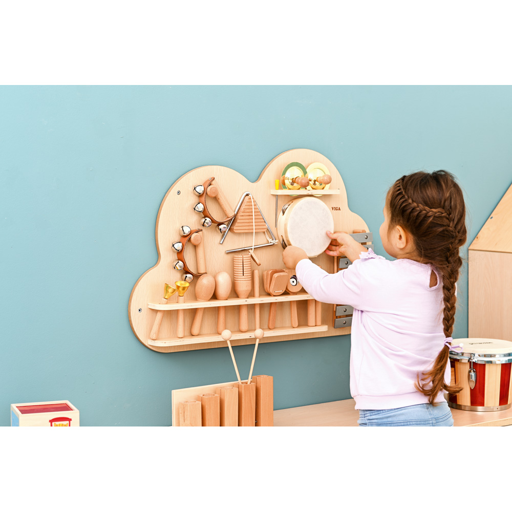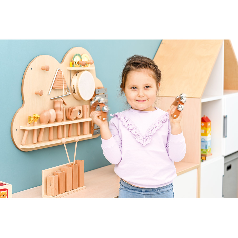 Platzsparendes Wandregal mit 12 Instrumenten. Das Instrumentenspielen fördert die musikalischen Fähigkeiten von Kindern. Die Kinder werden zum Ausprobieren und Kreativwerden animiert. Sie können ihr eigenes Minikonzert veranstalten und gleichzeitig auf spielerische Weise etwas über Musik und Rhythmus lernen. Alle Instrumente sind aus massivem Buchenholz gefertigt, was Langlebigkeit und hervorragende Klangqualität garantiert.