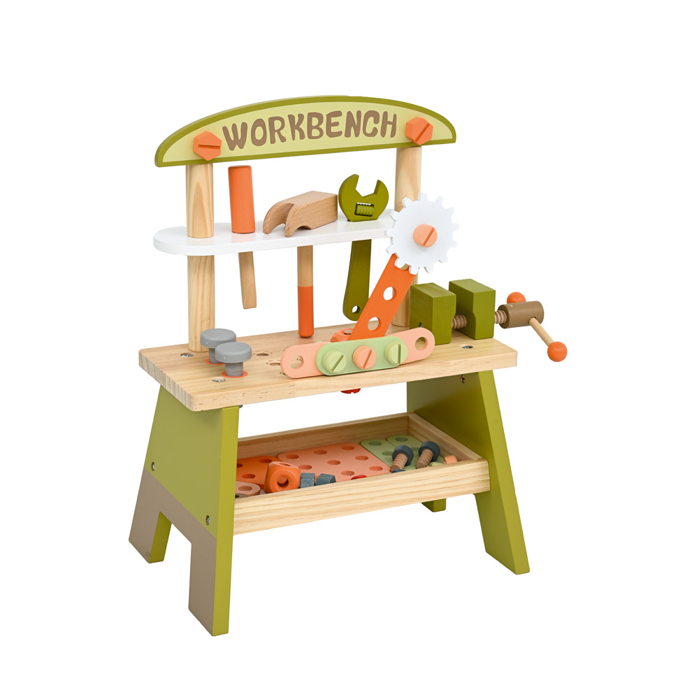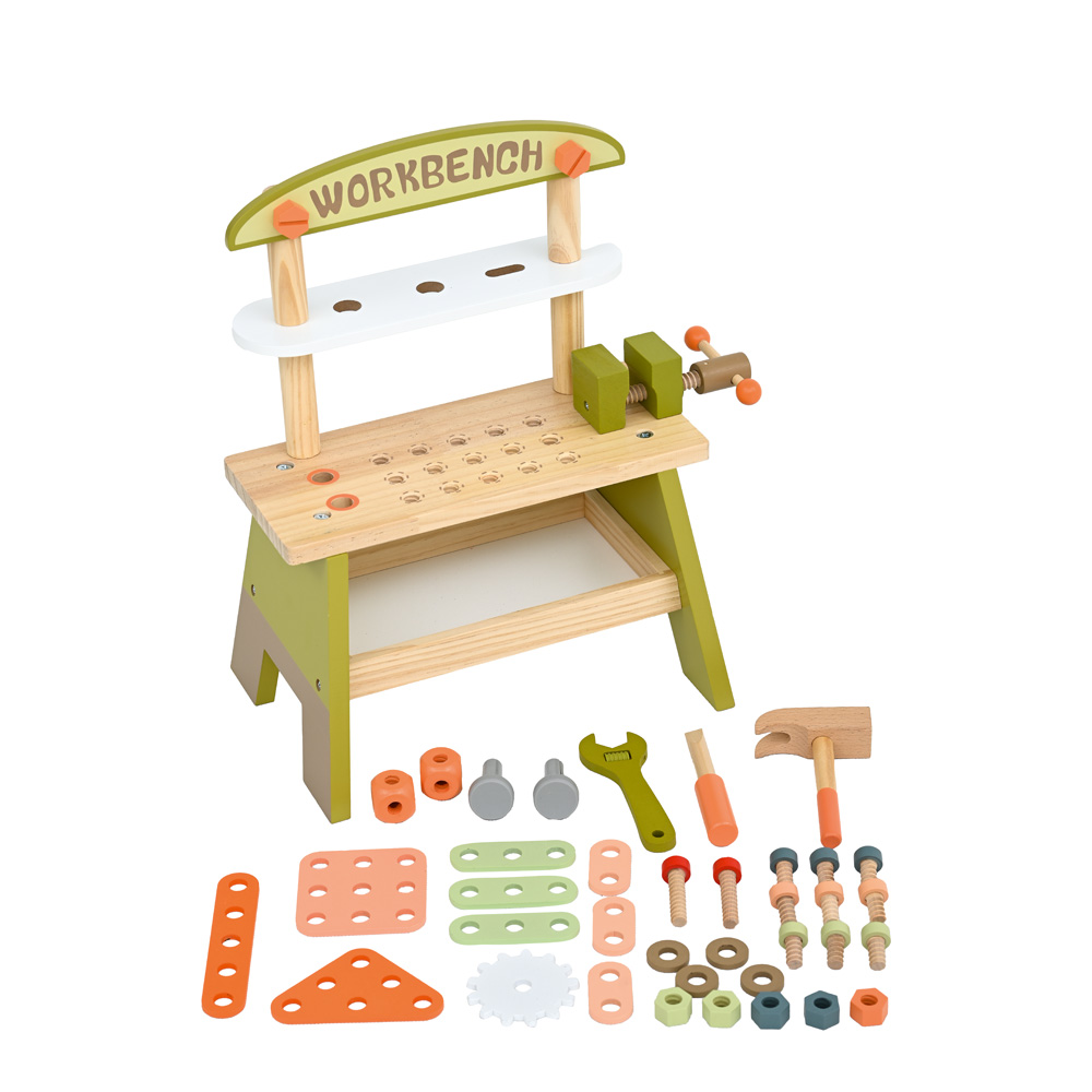 Werkbank für kleine Handwerker. Tolles Werkzeug und viele grosse und bunte Schrauben und Muttern begeistern die kleinen Kinder. Fördert Fantasie, Kreativität und Feinmotorik.