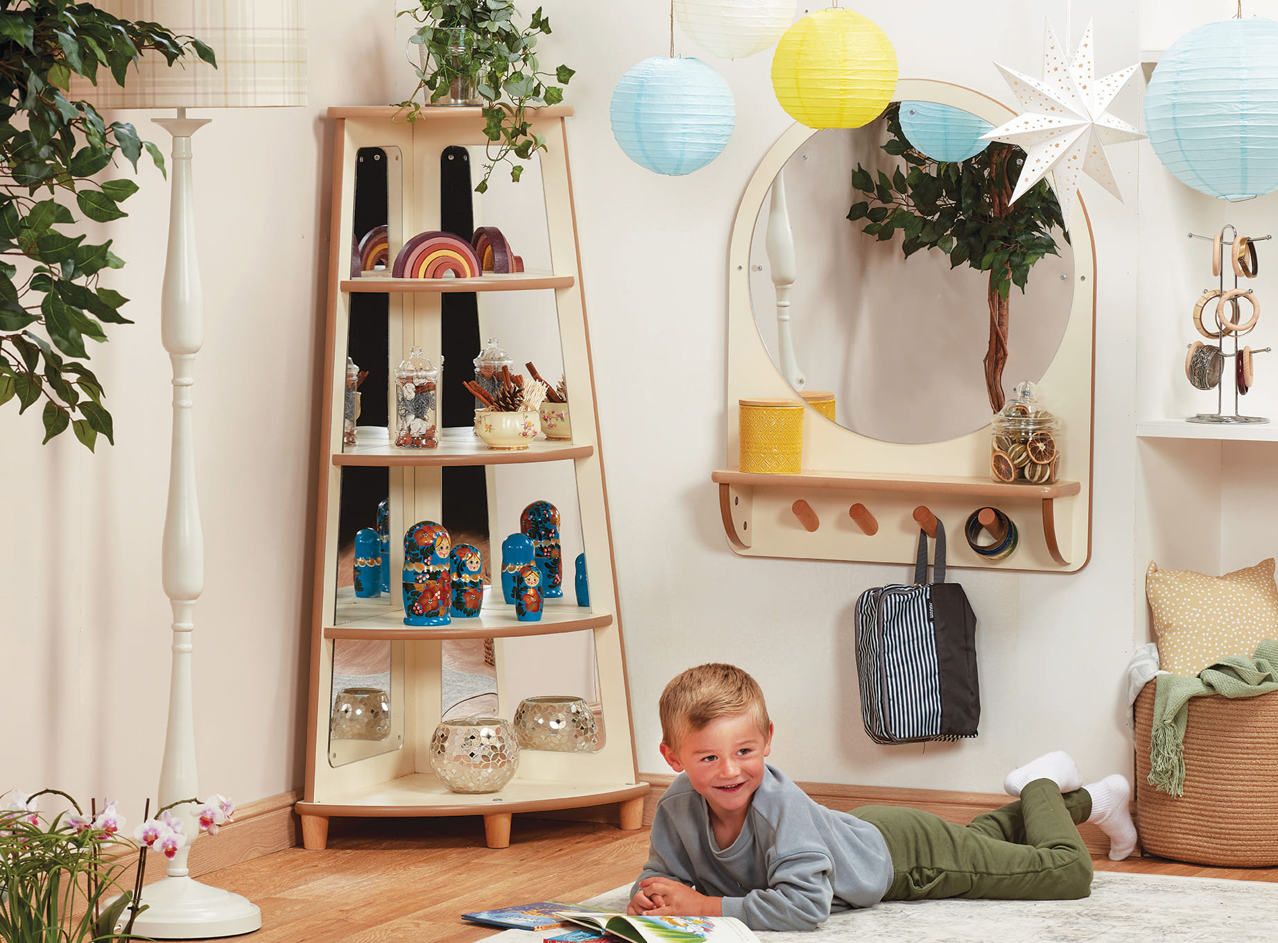Dieses einzigartige Ausstellungsstück wird mit Sicherheit die Neugier von Kindern wecken. Das Kaleidoskop-Eckregal ist das perfekte Möbelstück, um die Ecke interessant zu gestalten und den Platz optimal zu nutzen.