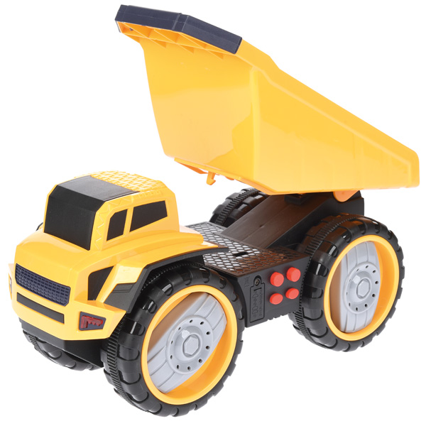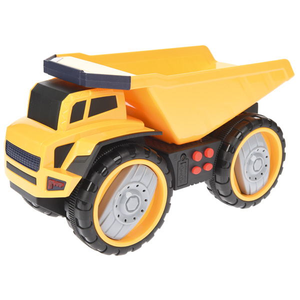 Das Fahrzeug leuchtet beim Fahren und lässt auf Knopfdruck 4 verschiedene Geräusche ertönen. 3 Batterien LR44 enthalten. Bewegliche Ladefläche lässt sich anheben.