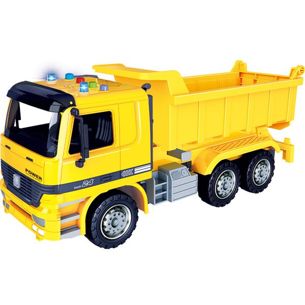 Diverse Sattelschlepper, die Geräusche machen. Mit abnehmbarem Anhänger. Am Führerhaus gibt es 4 Knöpfe, die Licht- oder Toneffekte hervorrufen. Vorderräder knattern auch ohne Batterien.