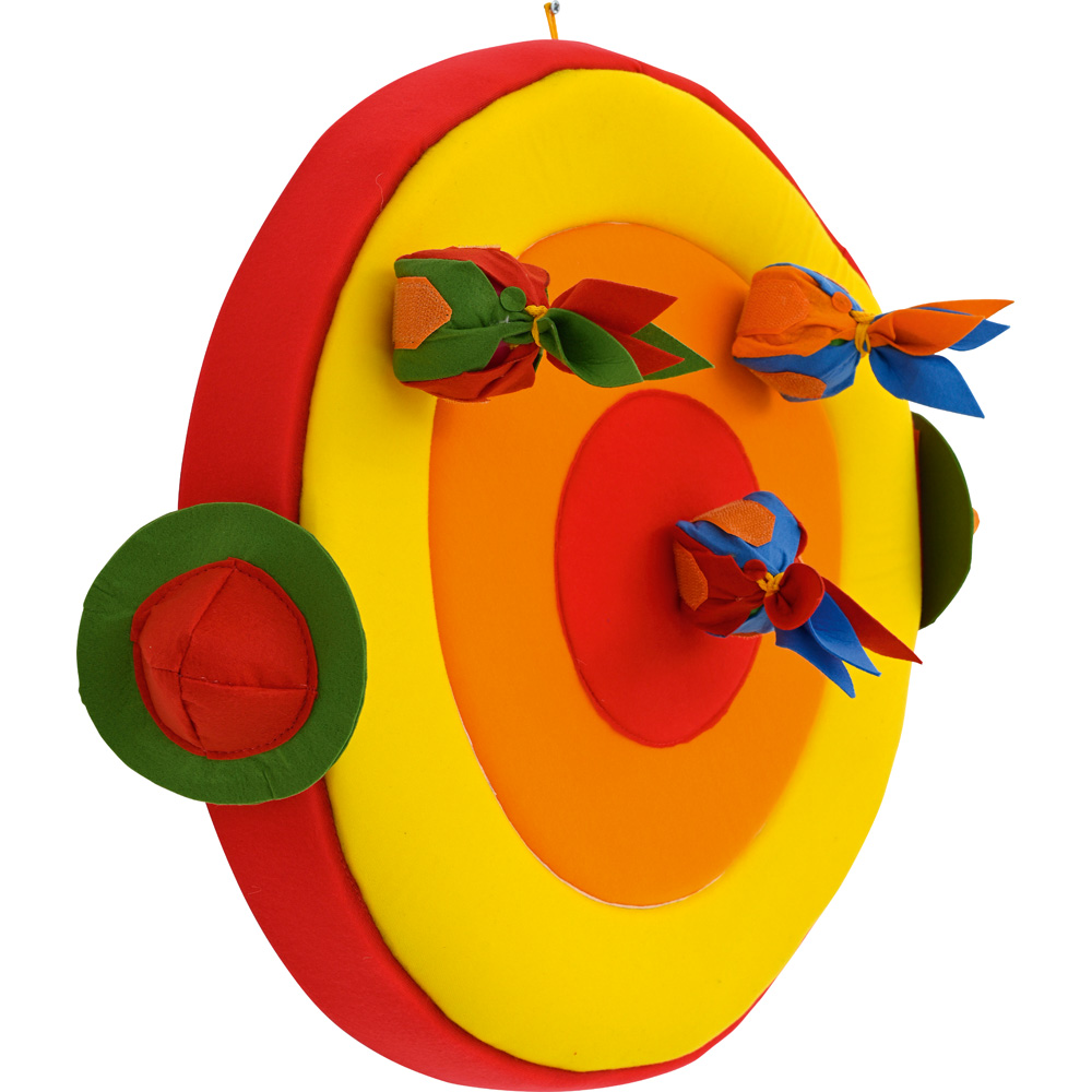 Mit diesem Wurfspiel werden Beweglichkeit und Zielgenauigkeit trainiert. Es kann ebenfalls als Hilfsmittel für die Arbeit mit sehbehinderten, blinden und hörgeschädigten Kindern genutzt werden. Es gibt mehrere Spielvarianten. Einmal werden 2 Klanghütchen seitlich an der weichen Dartscheibe befestigt und diese an die Wand gehängt. Die Wurfsäckchen werden in Richtung Dartscheibe geworfen, dies kann auch mit geschlossenen oder verbundenen Augen geschehen Die Säckchen haften mit Klett an der Dartscheibe. In einer anderen Version werden Bälle oder Bohnensäckchen in einen Korb geworfen, an dem ebenfalls die 2 Hütchen befestigt sind. In den Wurfgegenständen befinden sich kleine Rasseln mit unterschiedlichen Tönen von laut bis leise. Diese signalisieren, wenn ein Ziel getroffen wurde. Die Bälle können auch einfach in verschiedene Richtungen ohne bestimmtes Ziel geworfen werden. Mit diesen Übungen lernen wir, die Richtung und Entfernung eines Ziels zu erkennen und die Wurfrichtung zu steuern. Nach dem Spiel wird alles im Korb verstaut und mit der Dartscheibe als Deckel verschlossen. Die Wurfsäckchen und die Klanghütchen sind aus Filz, alle übrigen Zubehörteile aus einem weichen Material.