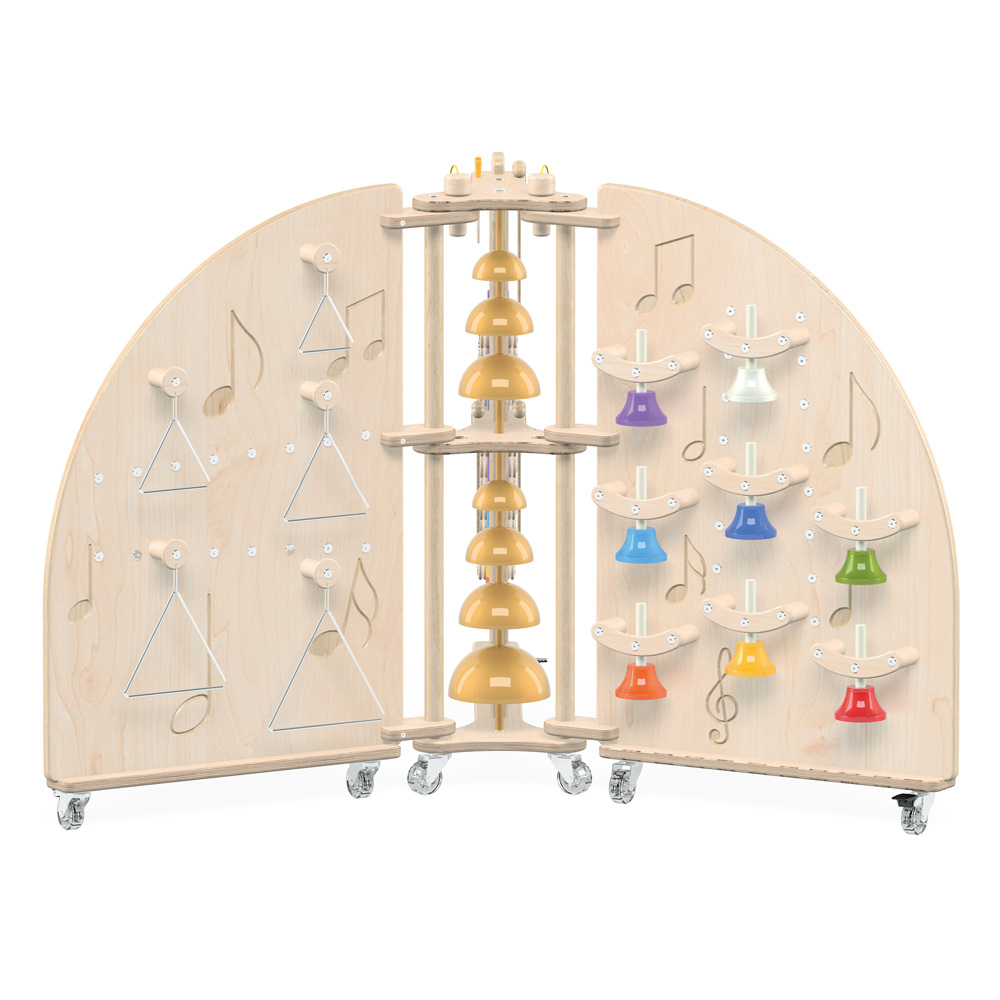 Die 3 Tafeln sind aus 18 mm starkem, lackiertem Sperrholz gefertigt, die Musikinsel ist mit 6 Rollen, davon 3 Aussenrollen mit Bremse, ausgestattet und die Glocken und das Glockenspiel sind pulverbeschichtet, um eine starke und dauerhafte Farbbeschichtung zu gewährleisten.