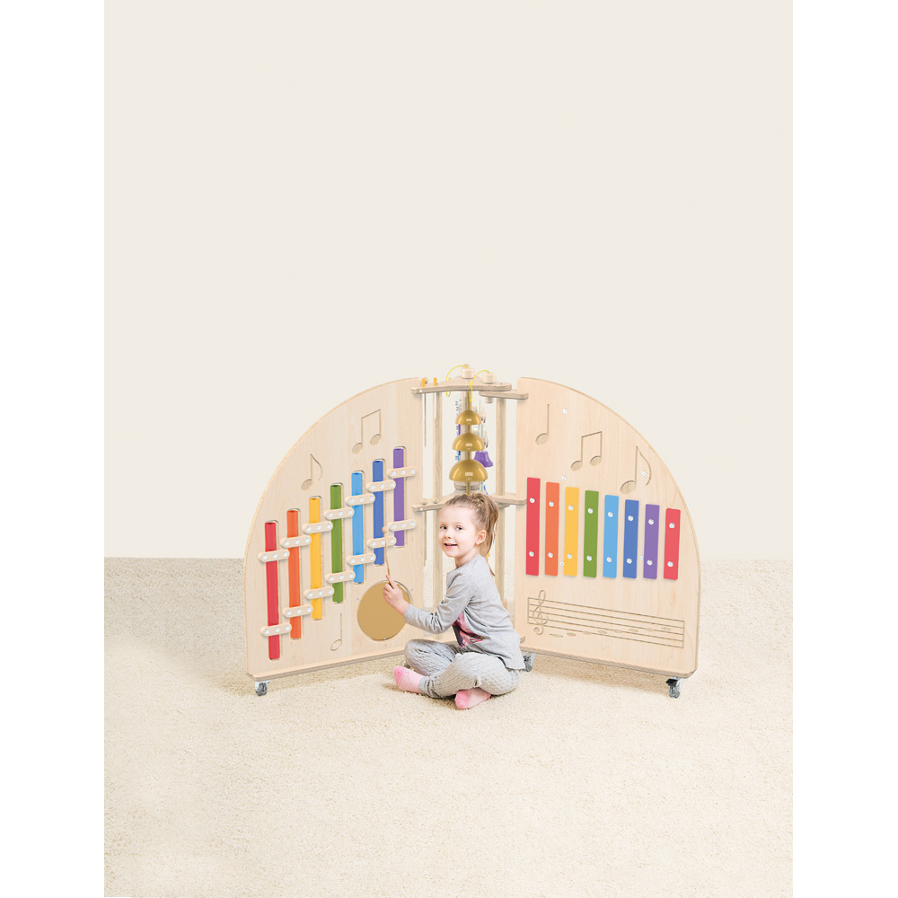 Eine Musikinsel, in der mehrere Instrumente konzentriert sind, die jeweils ein anderes Hörerlebnis bieten. Sie eignet sich gut für den musiktherapeutischen Unterricht, für die Arbeit mit Kindern mit besonderen pädagogischen Bedürfnissen und für alltägliche Aktivitäten mit Kindern. Die in die Tafel eingeritzte musikalische Bandbreite macht die Kinder mit den Noten und ihrer grundlegenden Anordnung auf dem Notensystem vertraut.