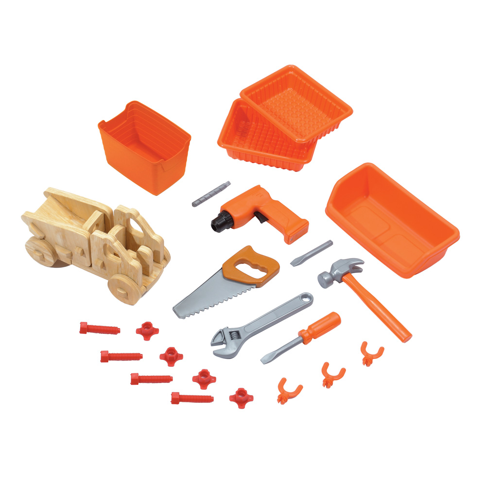 • 1 Schraubstock • 1 Bohrmaschine • 1 Hammer • 1 Säge • 1 Schraubendreher • 1 Schraubenschlüssel • 4 Behälter • 4 Haken • diverse Holzteile (aus Schaumstoff)