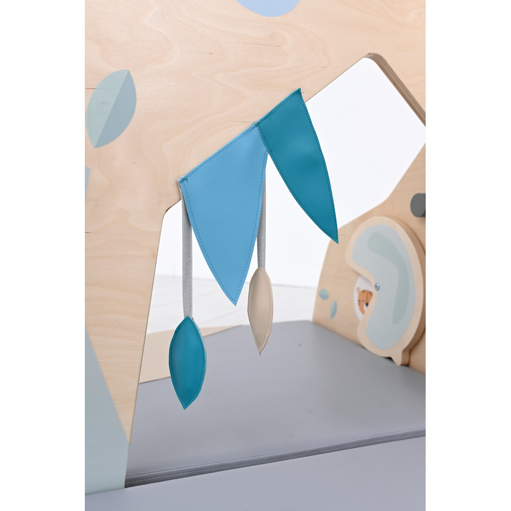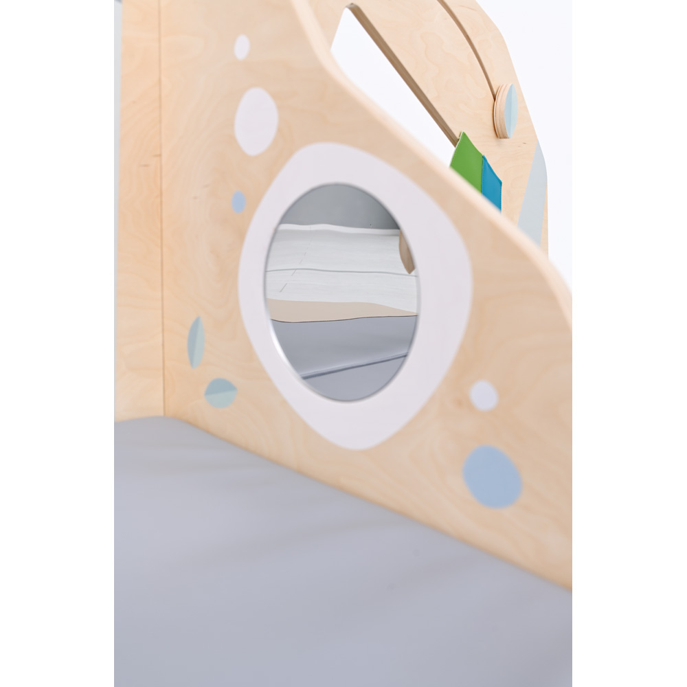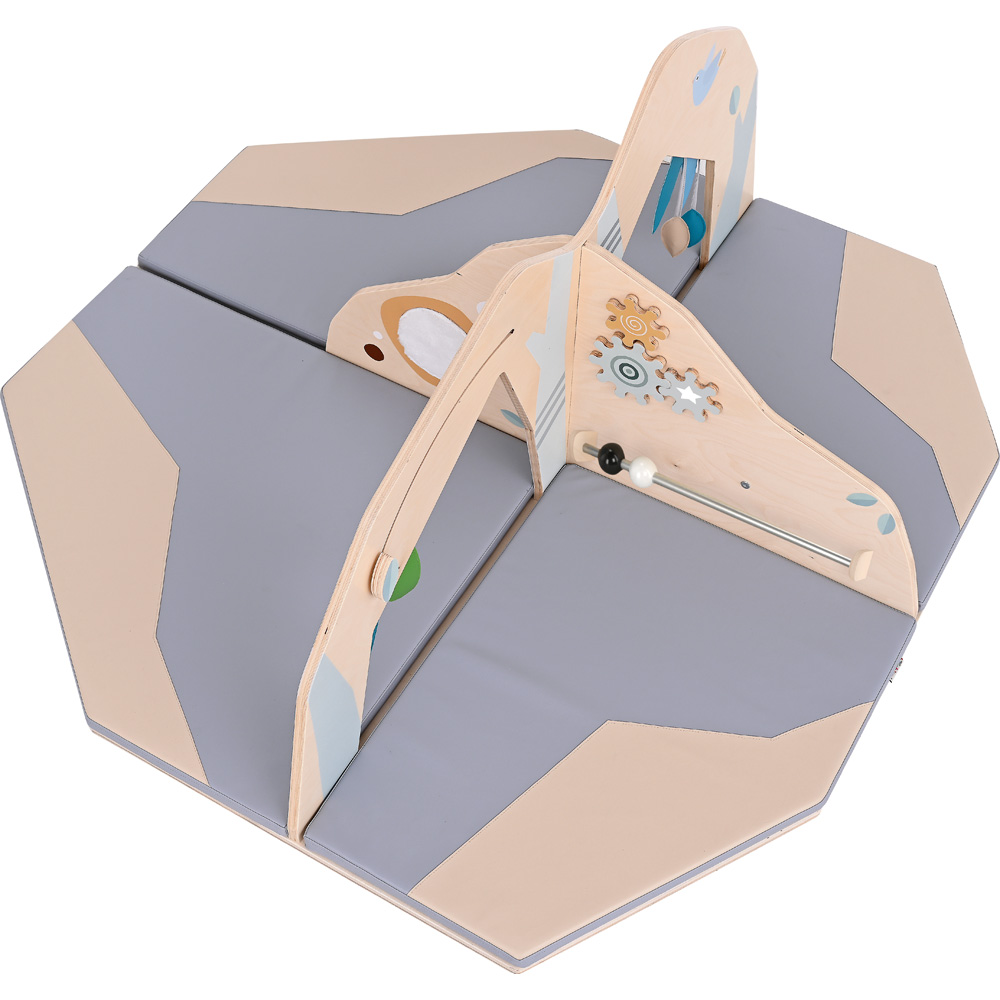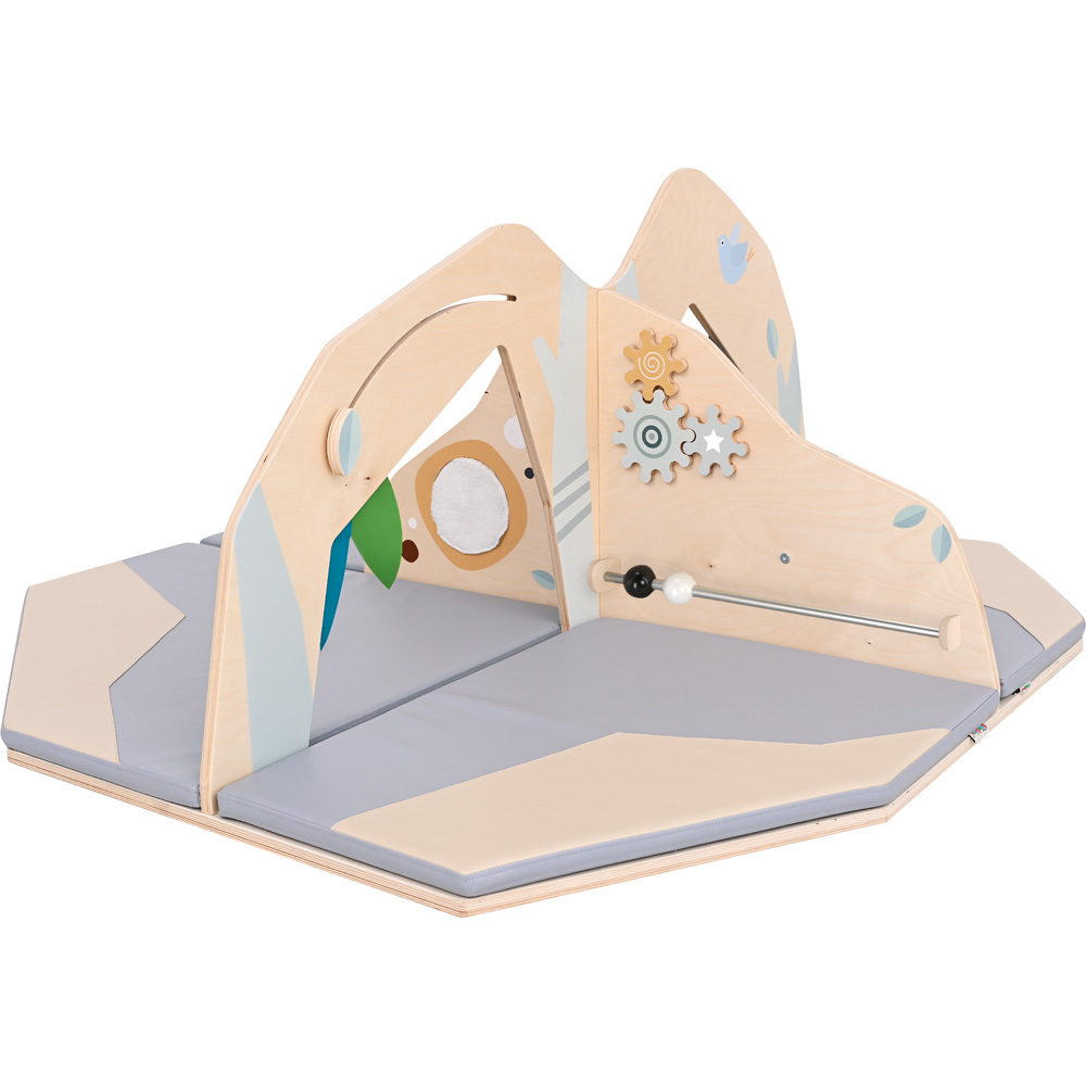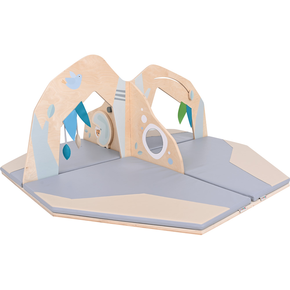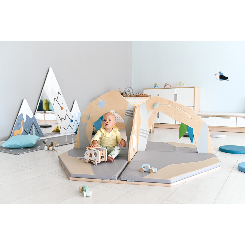 Ein schöner Platz für das besondere Spielerlebnis! Die mit Gebirgsmotiven dekorierte Spielecke ist von vielen Seiten begehbar und mit einer Matte gepolstert. An den vier Wänden gibt es viele attraktive sensorische Elemente (z.B. flauschiger Plüsch, Rundspiegel) sowie Spiele zur Schulung der Handmotorik.
