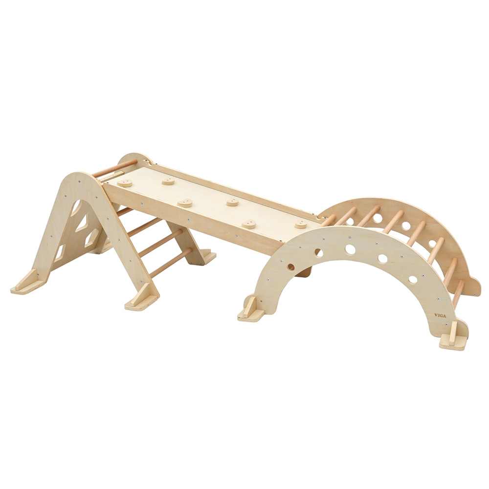 Set aus Holzwippe, Kletterdreieck und Rutsch-Kletterwand, beliebig kombinierbar. Das Set ist langlebig und sicher in der Anwendung.