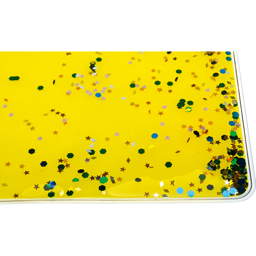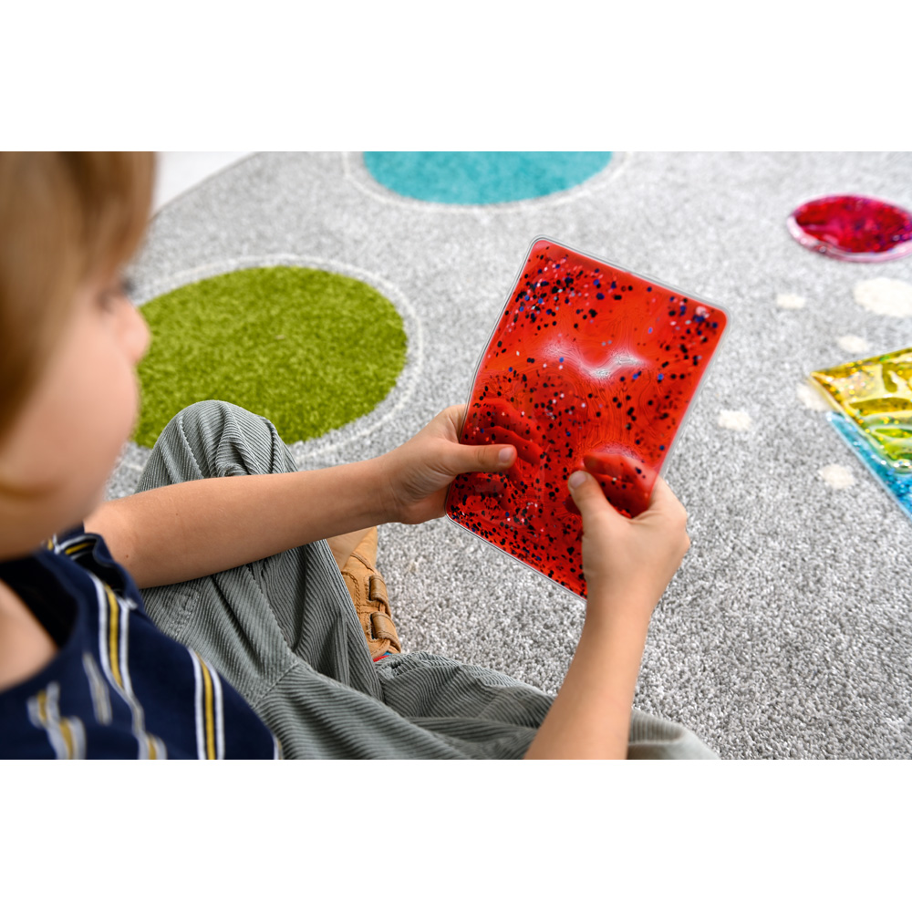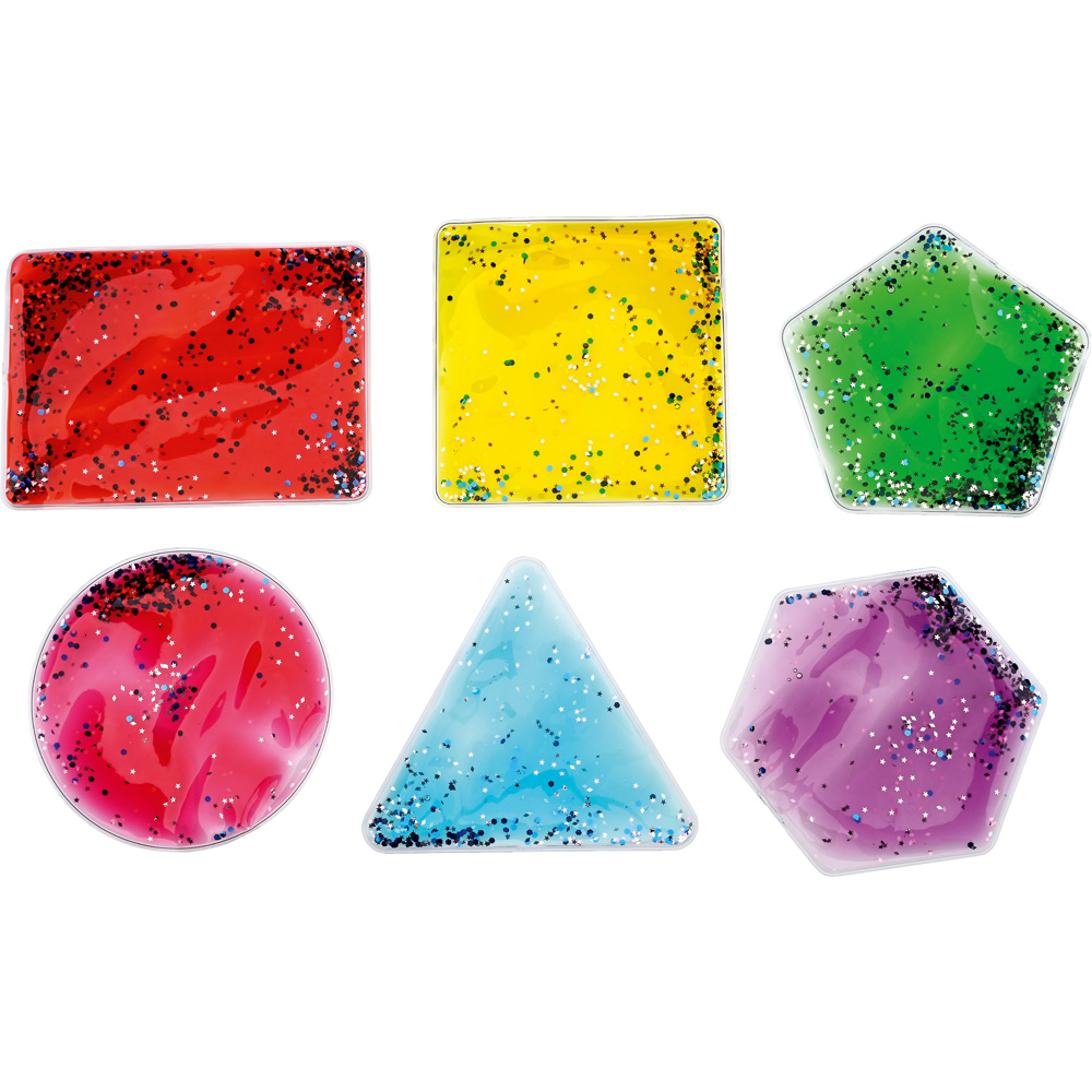 Nach Herzenslust können die geometrischen Formen geknetet und gepresst werden. Sie kehren immer wieder in ihre Ausgangsform zurück. Dabei blubbern in ihrem Inneren dobrenfrohe Glitzerelemente. Mit viel Spass lernen die Kinder etwas über Formen, Farben und Grössen.