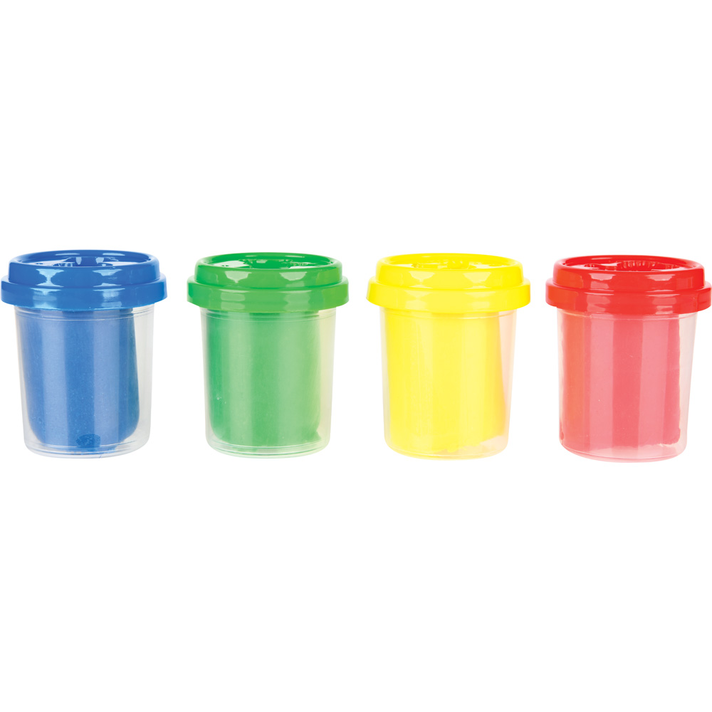 Die Farben können miteinander gemischt werden. Jede Dose hat einen Deckel mit unterschiedlichen Ausstechmotiven. Das Formen mit Knetmasse regt die Fantasie an, entwickelt manuelle Fähigkeiten und hilft, Farben unterscheiden zu lernen.