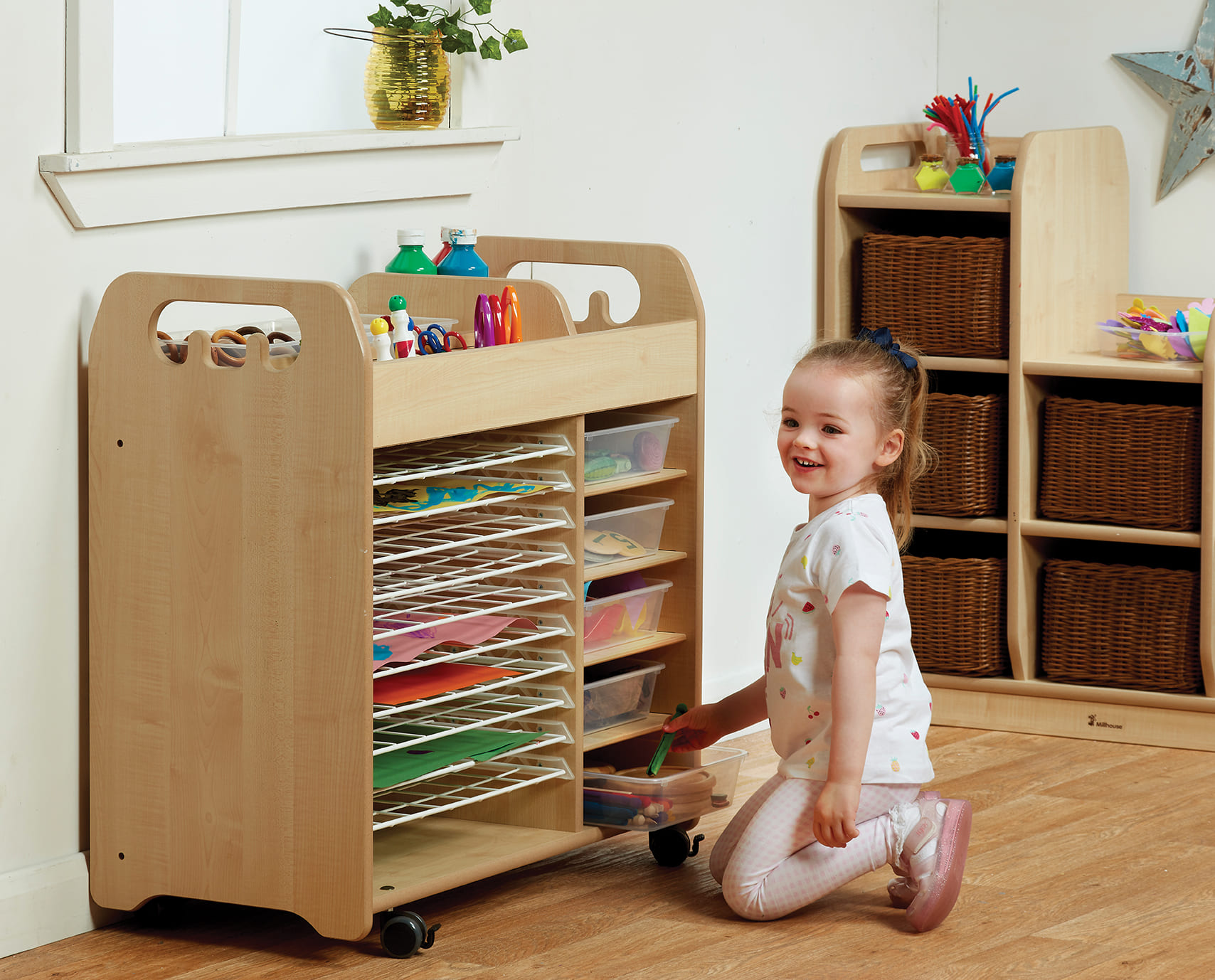Der Natura Kombi-Trocknungswagen für Malutensilien zeichnet sich durch sein kompaktes Design und seine Vielseitigkeit aus. Er ist die ideale Lösung für Räume mit begrenztem Platzangebot. Die grossen und kleinen transparenten Boxen fördern die Selbstorganisation, während die Trockenständer und Farb-/Stiftbehälter dazu beitragen, einen funktionalen Raum zu schaffen.