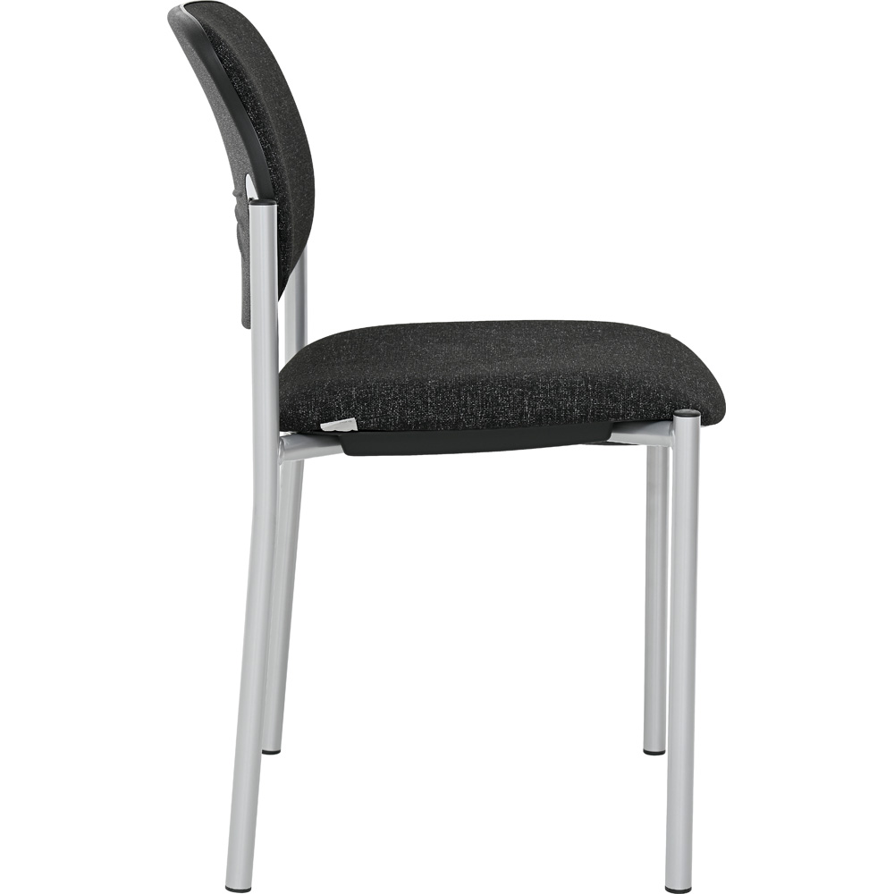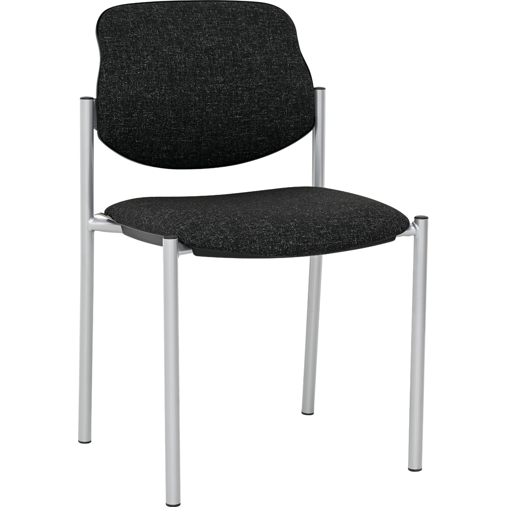 Sitz und Rückenlehne des Stuhls sind gepolstert; Gestell aus alufarbenem Rundrohr. Stapelbar bis 6 Stck.