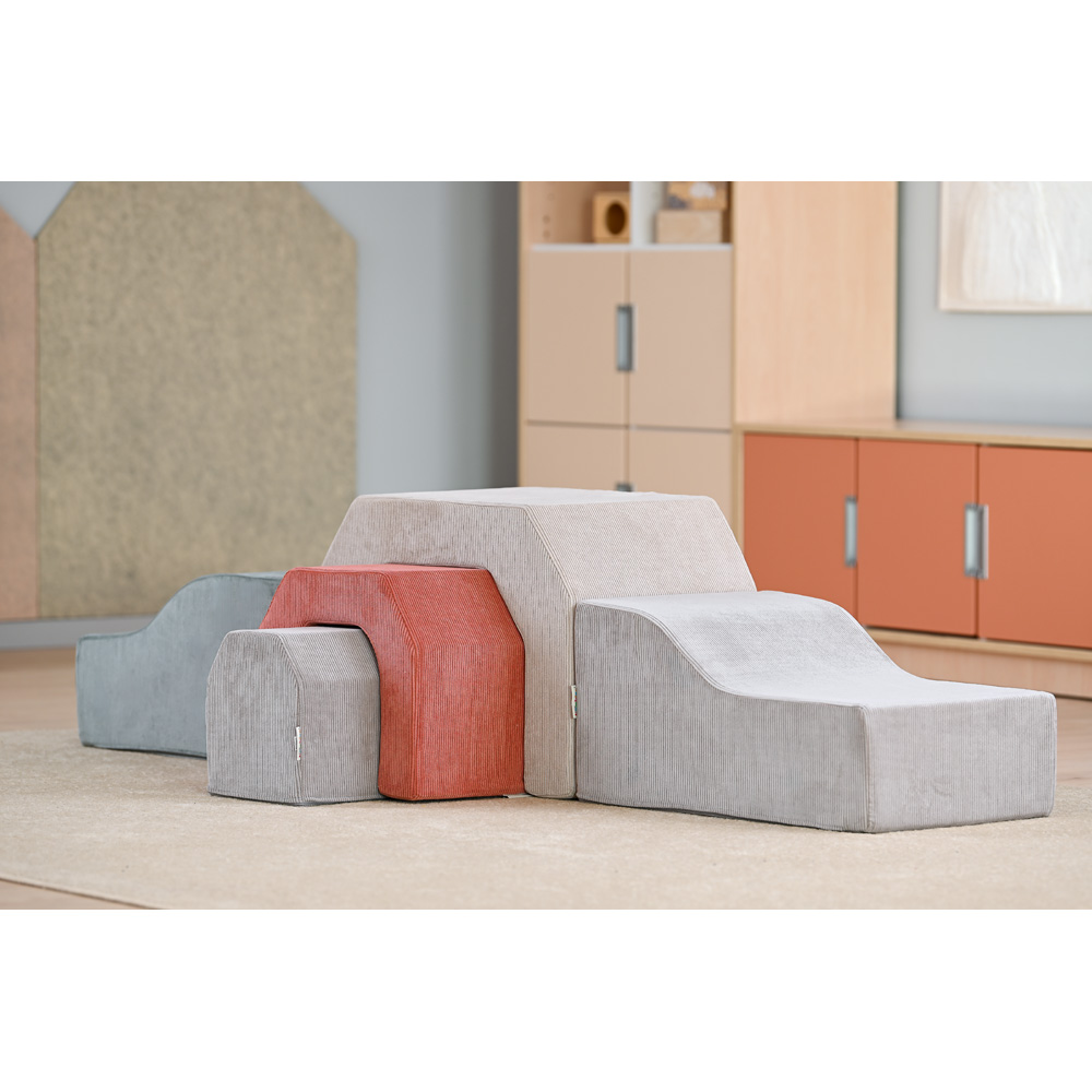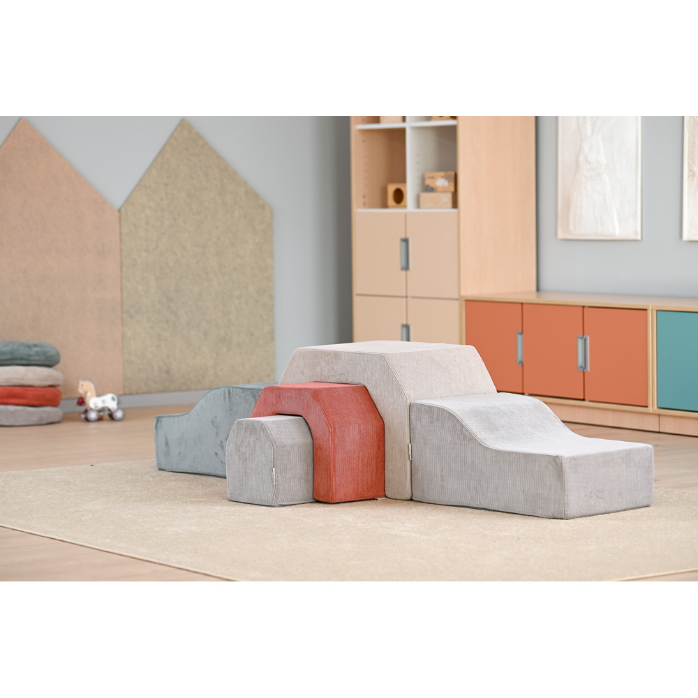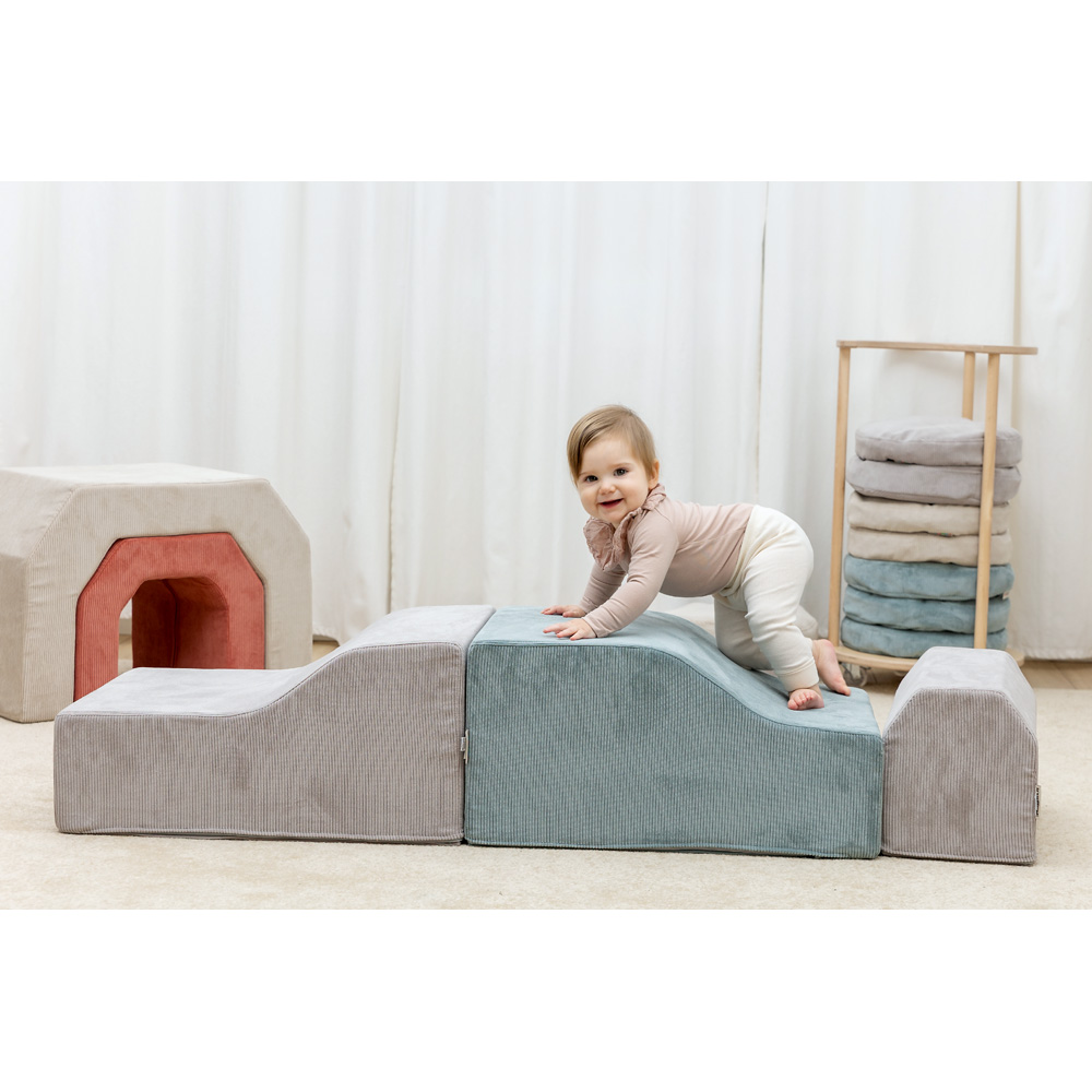 Fünf aufeinander abgestimmte Schaumstoffteile, die eine Krabbelecke bilden. Der Parcours kann immer wieder neu aufgestellt werden. So werden die Kinder animiert, ihn aufs Neue zu entdecken. Bezug aus weichem Cord ist robust und hat eine anregende Haptik. Zur Aufbewahrung sind alle Teile kompakt ineinander stapelbar.