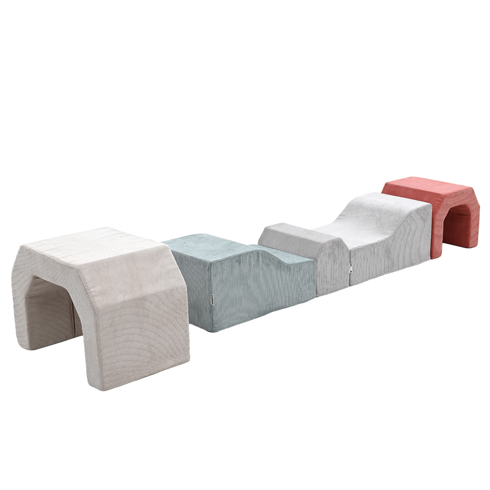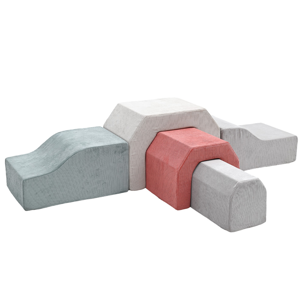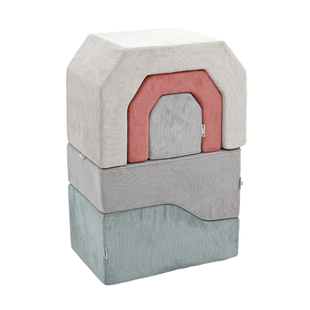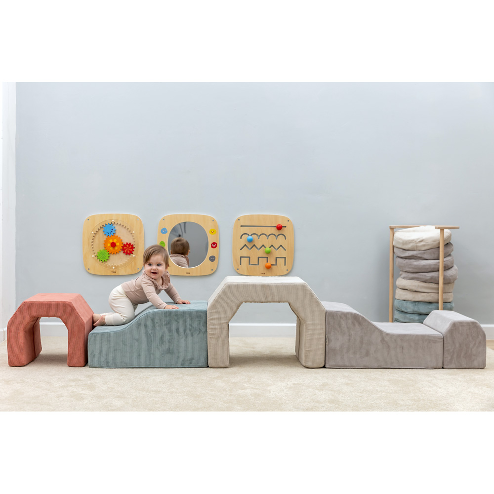 Fünf aufeinander abgestimmte Schaumstoffteile, die eine Krabbelecke bilden. Der Parcours kann immer wieder neu aufgestellt werden. So werden die Kinder animiert, ihn aufs Neue zu entdecken. Bezug aus weichem Cord ist robust und hat eine anregende Haptik. Zur Aufbewahrung sind alle Teile kompakt ineinander stapelbar.