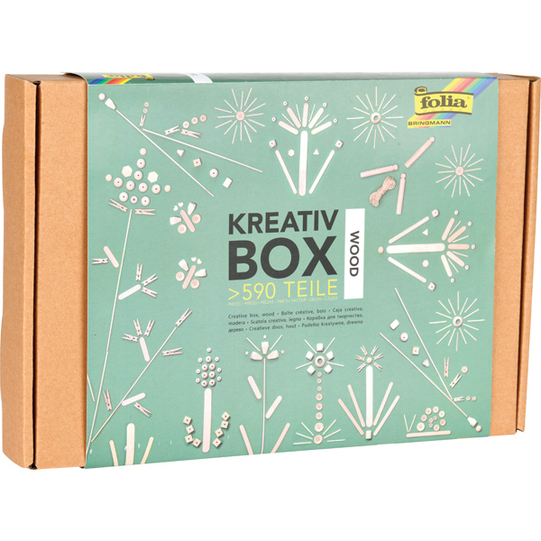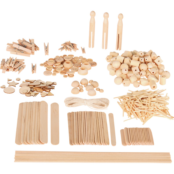 • 50 Holzstäbchen, flach • 50 Streuteile • 50 Holzperlen, geometrisch • 50 Knöpfe • 40 Holzperlen, rund • 30 Holzklammern • 12 Halbkugeln • 10 Holzstäbchen, rund • 3 Wäscheklammern • 1 Band, 10 m