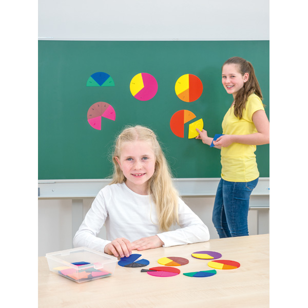 Farbige Kreise aus Kunststoff, geteilt in Segmente. Sie veranschaulichen Grössenverhältnisse, Teil-Ganzes-Beziehungen, Brüche und Prozentzahlen und eignen sich auch für einfache Legeübungen. • einseitig beschriftet • aus Kunststoff • 51 Kreissegmente • Kreisdurchmesser: 20 cm • in einer stabilen Kunststoffbox • Segmente von 1/1 bis 1/12