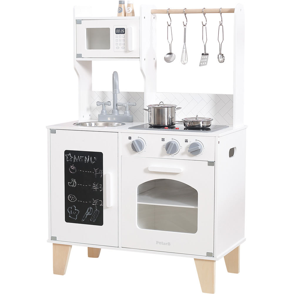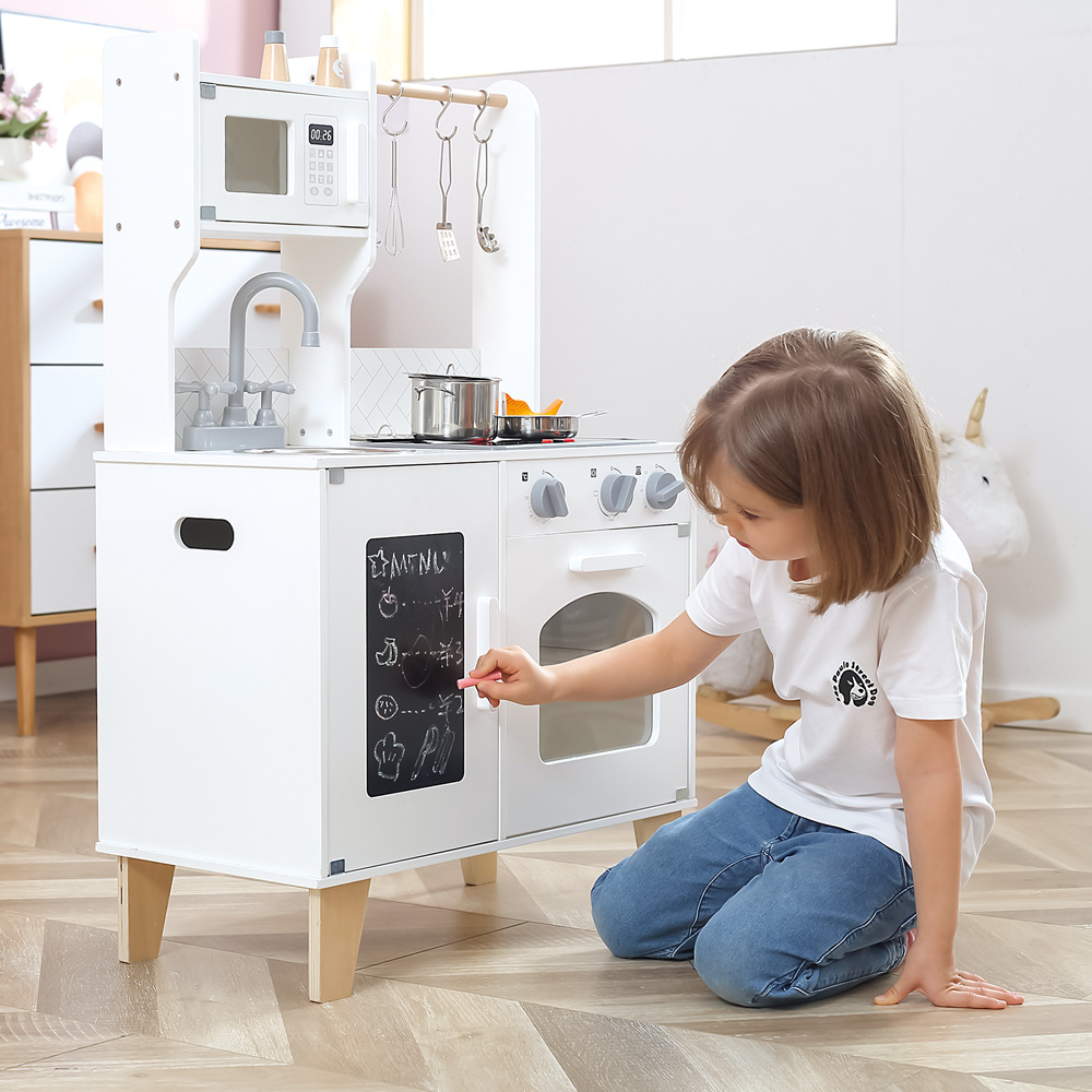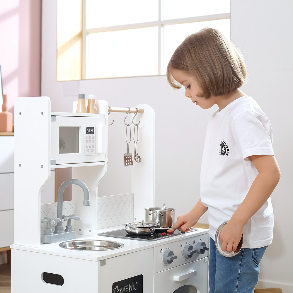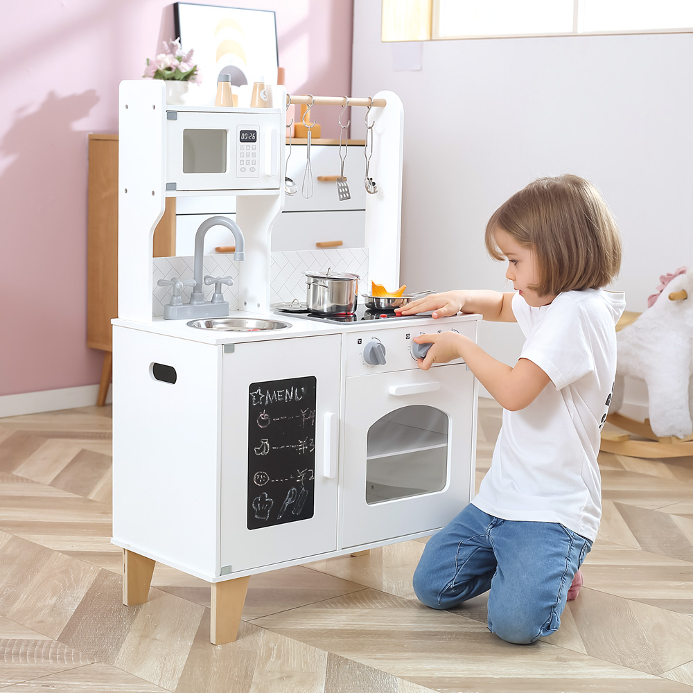 Spielküche im modernen Stil gehalten. Sie ist ausgestattet mit Mikrowelle, Spüle, Wasserhahn, Kochfeld, Backofen, Schrank mit Kreidetafel an der Tür und Zubehör. Sie macht Geräusche und leuchtet.